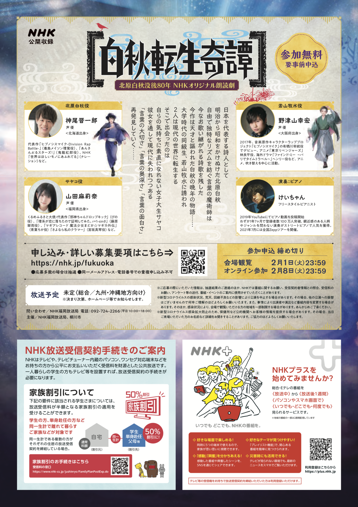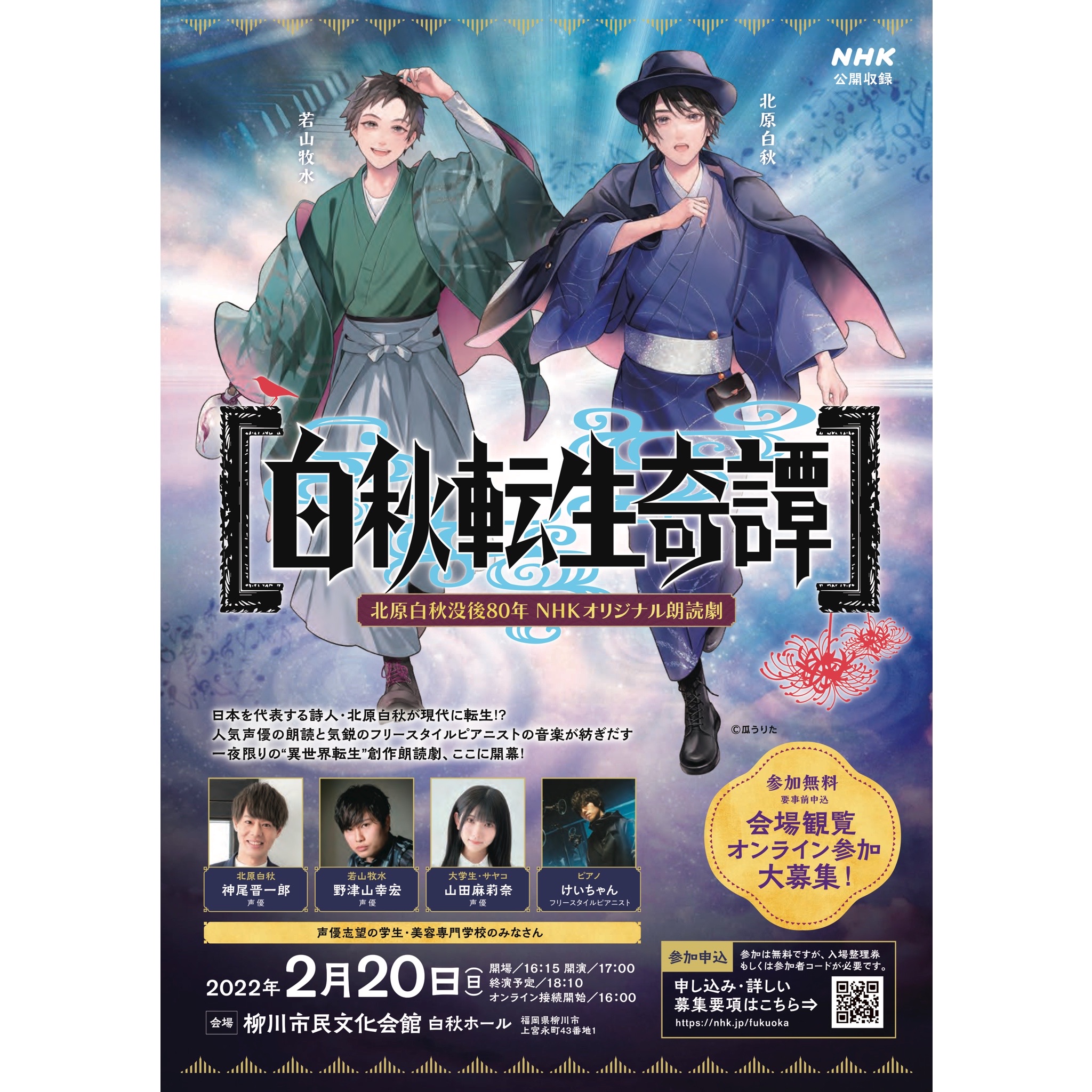 2022年2月20日(日)、福岡県柳川市上宮永町の柳川市民文化会館 白秋ホールにて、NHKオリジナル朗読劇「白秋転生奇譚」の公開収録を実施します。