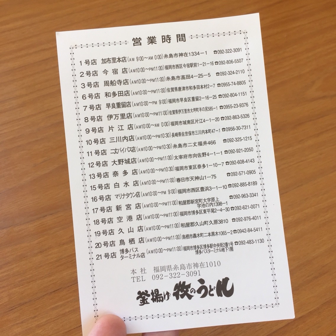 店内に設置されている意見要望書の裏面に店舗一覧が掲載されていますが、現在の牧のうどんの店舗数は、以下の18店舗のようです。