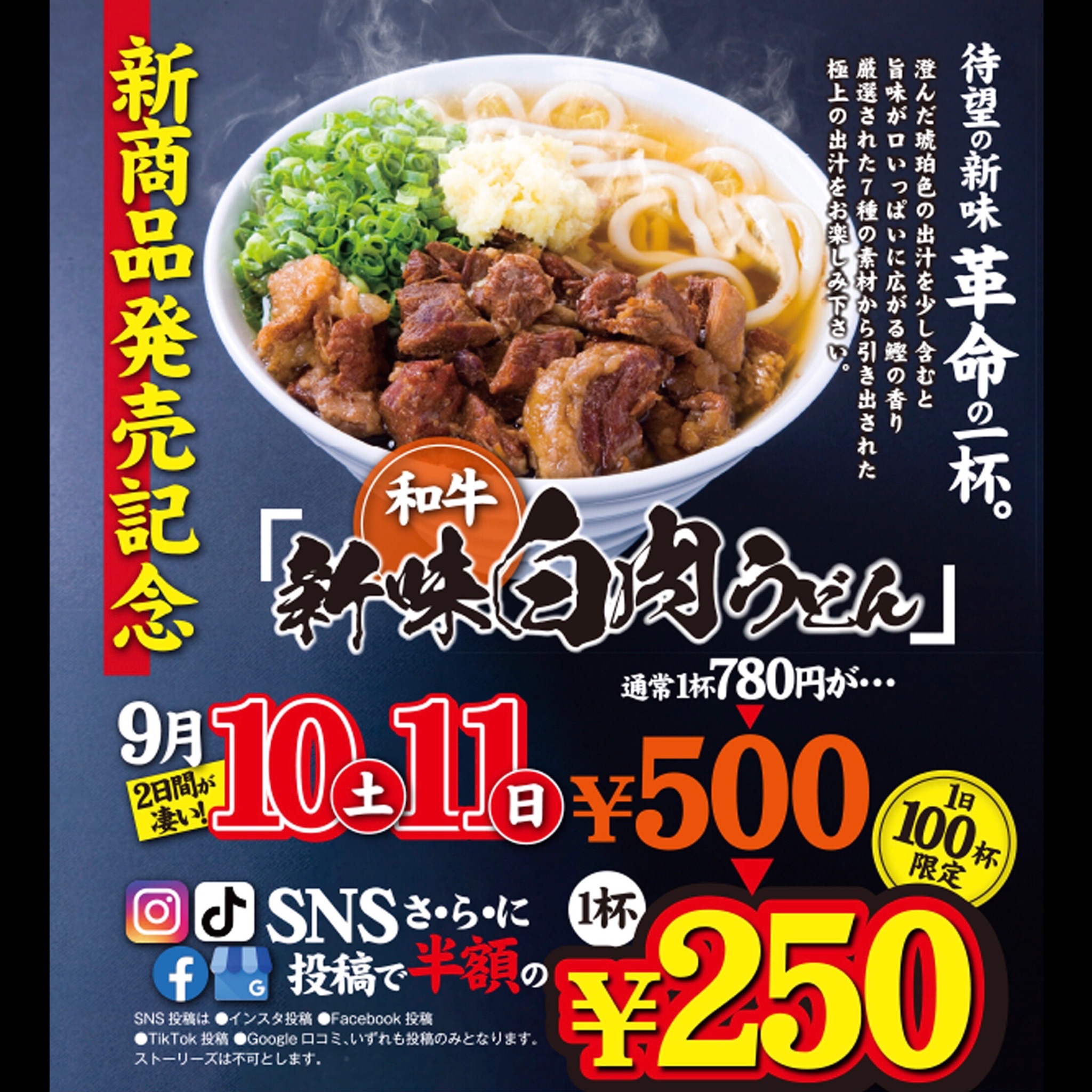 2022年9月10日(土)と11日(日)、福岡県北九州市小倉南区朽網東の「肉うどん いのうえ 朽網店(くさみ店)」にて、新商品「新味白肉うどん」の発売記念キャンペーンが開催されます。