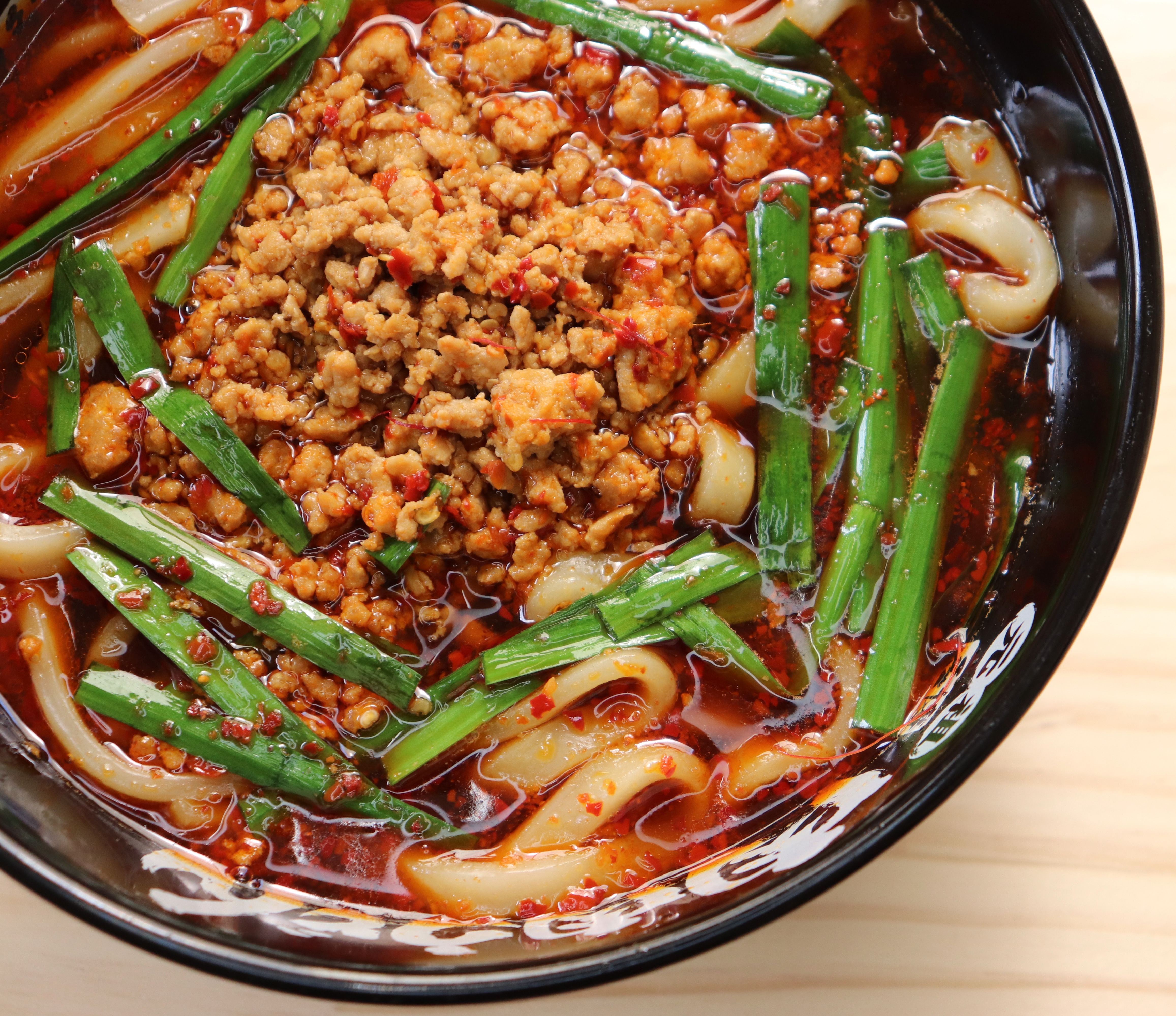 肉肉うどんの和風魚介だしと牛だしをブレンドしたコクと旨味のスープをベースにし、さらに辛さの中にかすかに甘みを感じて欲しいと豚ミンチをたっぷり潜ませ、豚の甘みが激辛のなにかちょっとしたやわらぎを与えてくれます。