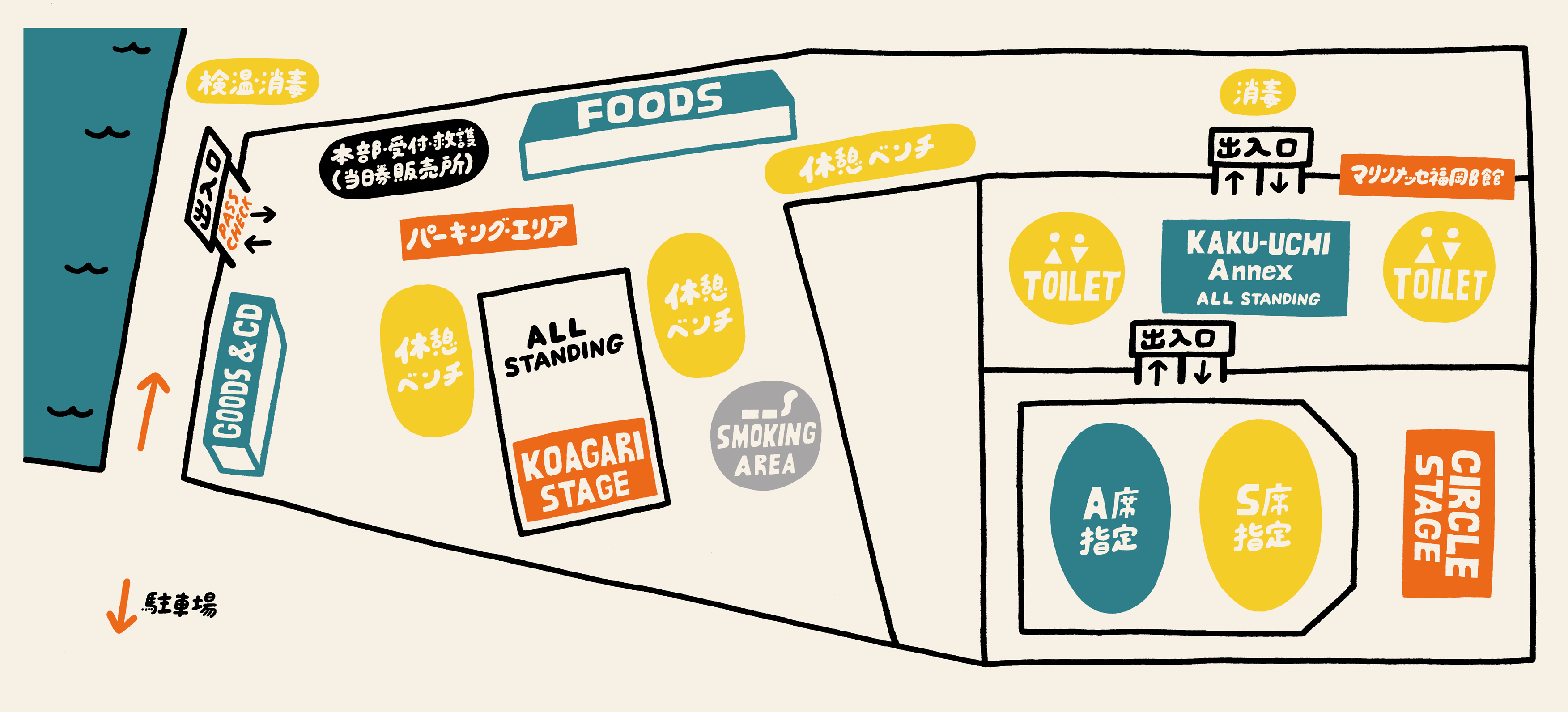 メイン・ステージの ”CIRCLE STAGE” はB館内に、サブ・ステージの “KOAGARI STAGE” と飲食ブースなどは、隣接するパーキング・エリアに設置します(海が見える!)。