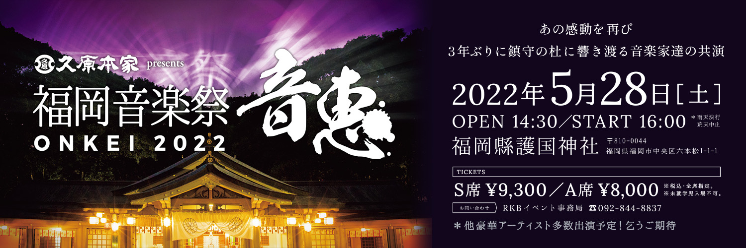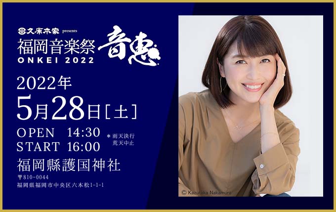 2022年5月28日(土)、福岡市中央区六本松の福岡縣護国神社にて、「久原本家 presents 福岡音楽祭 音恵(おんけい)ONKEI 2022」が開催されます。
