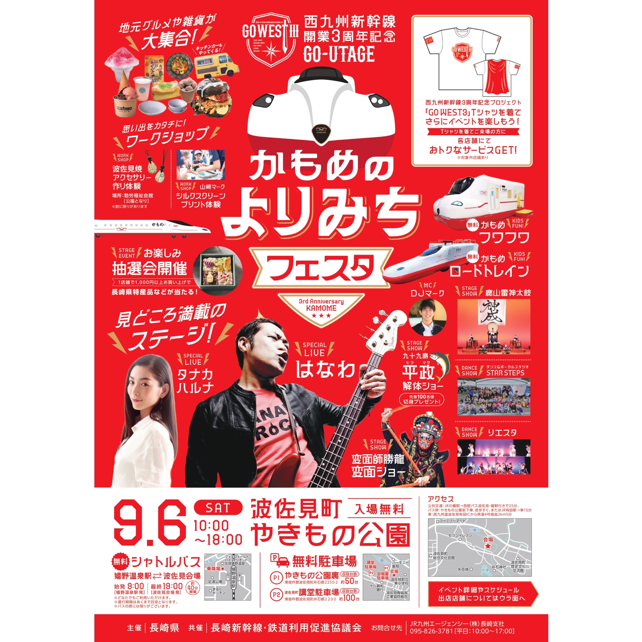 主催は長崎県、共催は長崎新幹線・鉄道利用促進協議会の入場無料のイベントで、同日にJR九州が開催する西九州新幹線開業3周年記念プロジェクト「GO WEST3」に合わせて開催される「GO-UTAGE」イベントです。