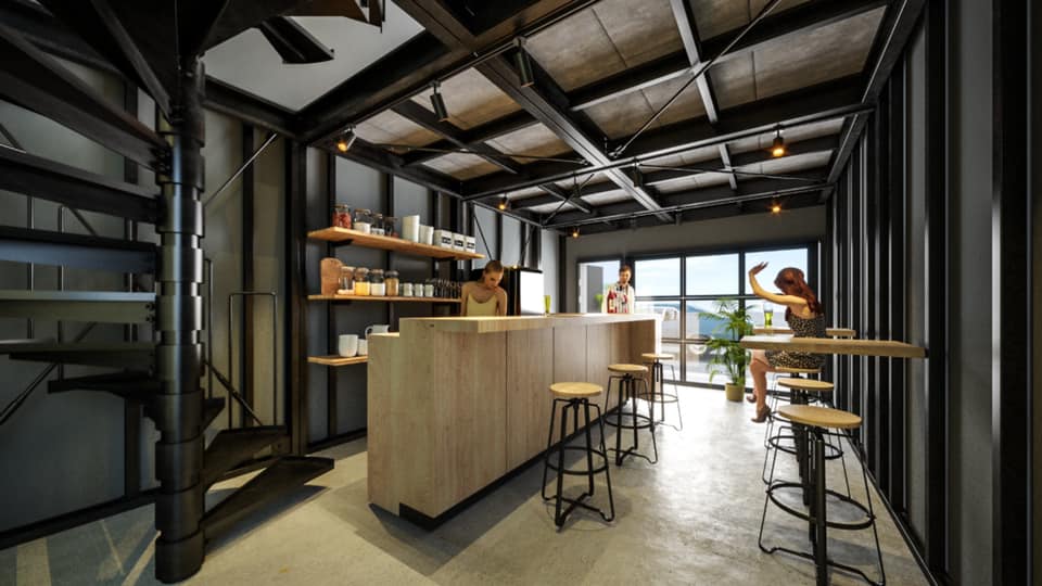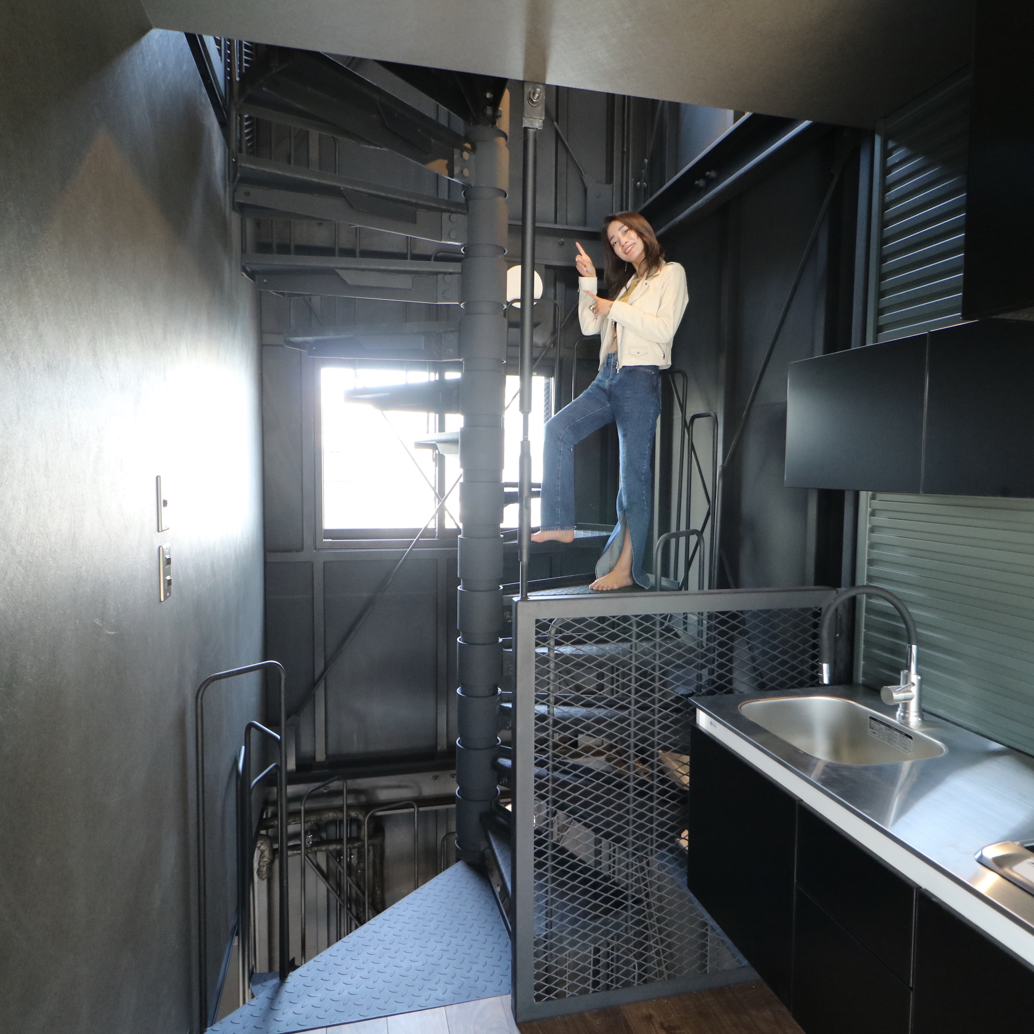 螺旋階段近く、右にキッチンスペース、左にトイレ、バスルームがあります。