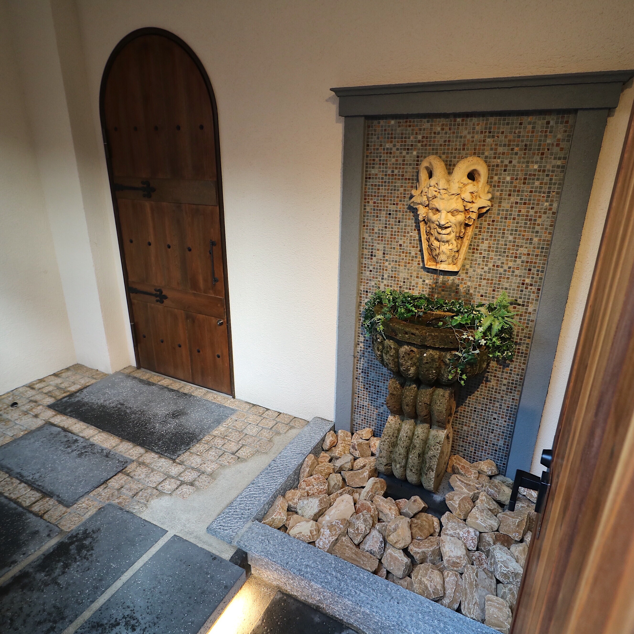 入口のドアの横には、酒の神「バッカス」のレリーフ彫刻と小さな泉があります。