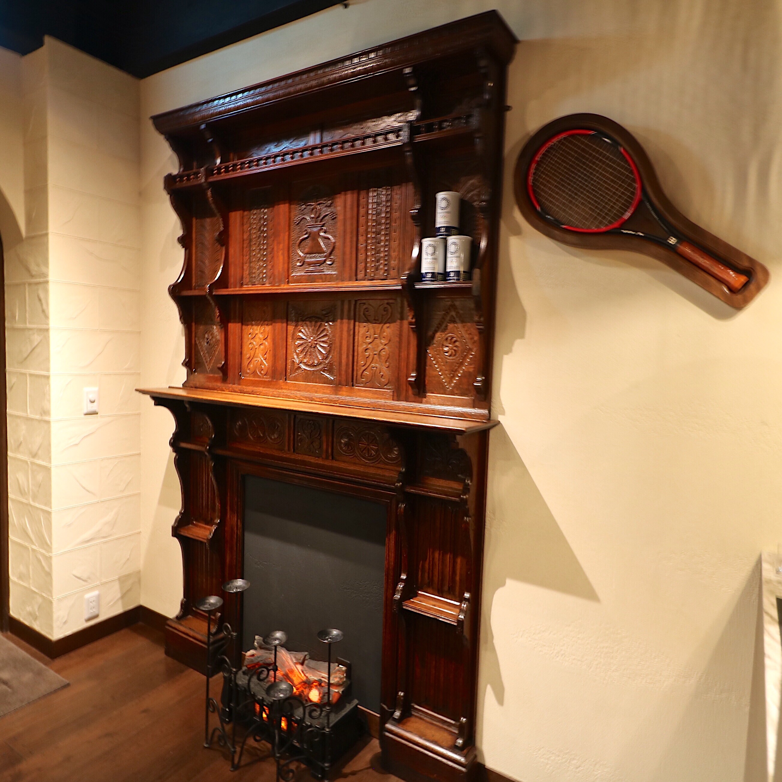 中に入ると、暖炉のオブジェとお店のオーナーさんの趣味からテニスラケットとテニスボールが飾られています。