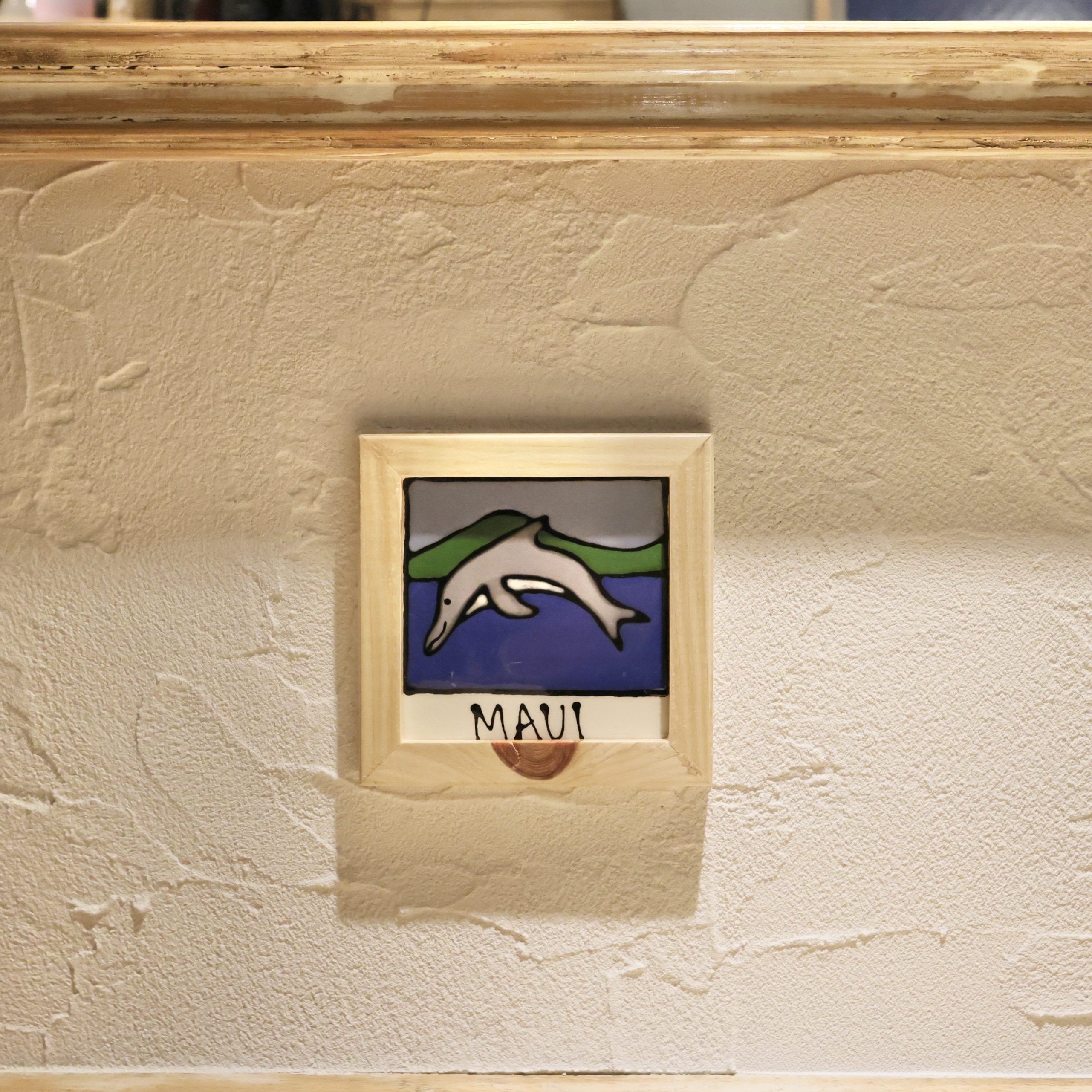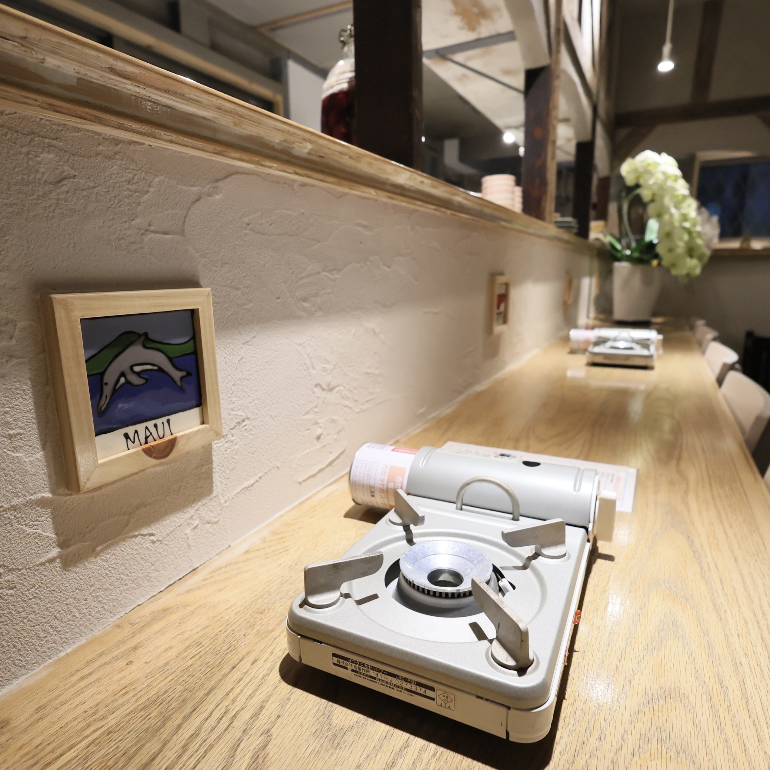 カウンター席の壁に貼られている3枚のタイルは、大将と女将さんがハワイ旅行に行かれたときに購入されたものだそうです。