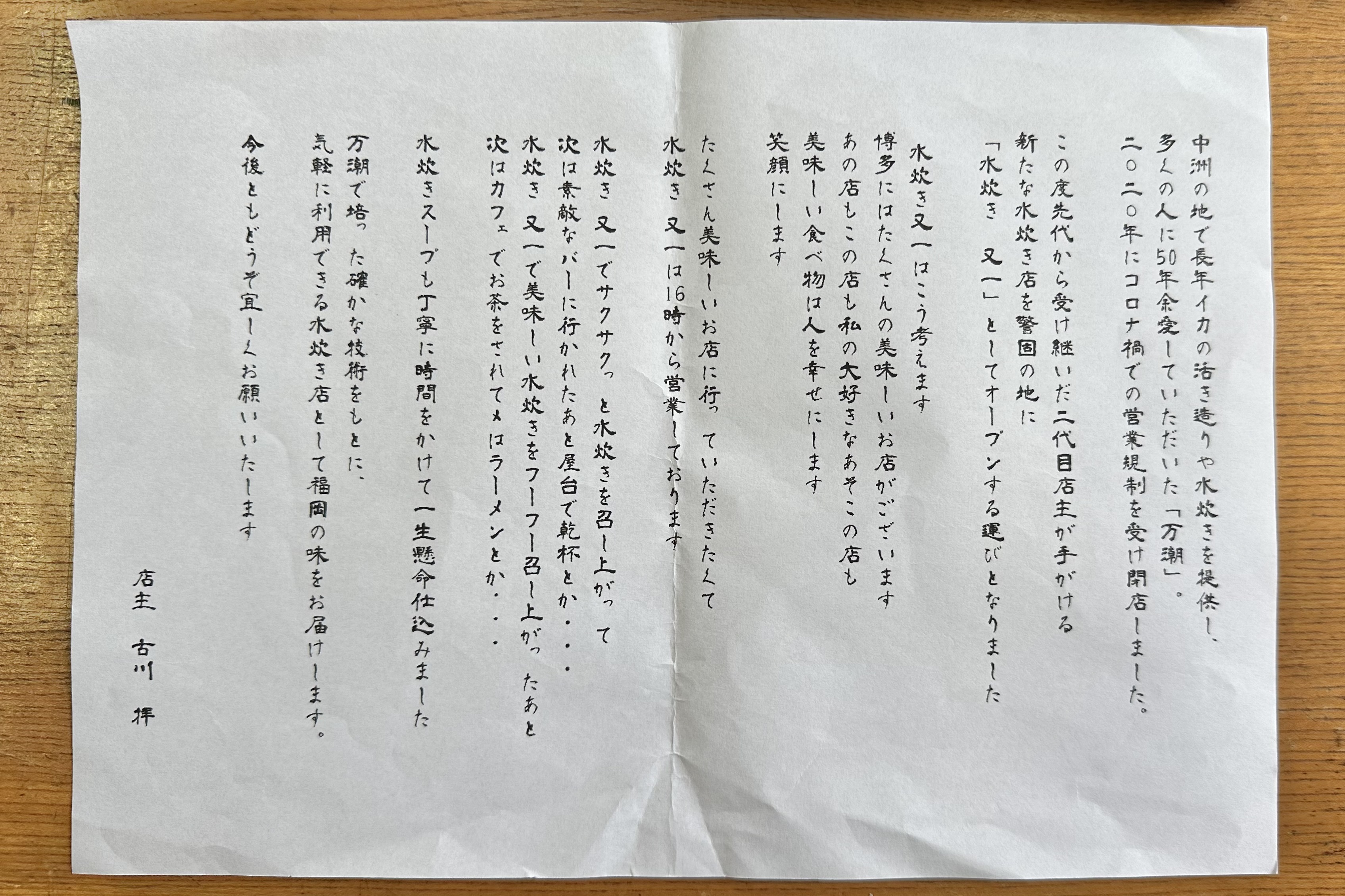 ■「水炊き又一」の店主 古川さんより