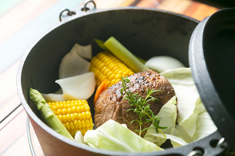 1テント2~8名がゆっくり過ごせる空間では、 ダッチオーブンで焼き上げるローストビーフやグリルハーブチキン、 地鶏のアヒージョなど贅沢なお料理でおもてなし。