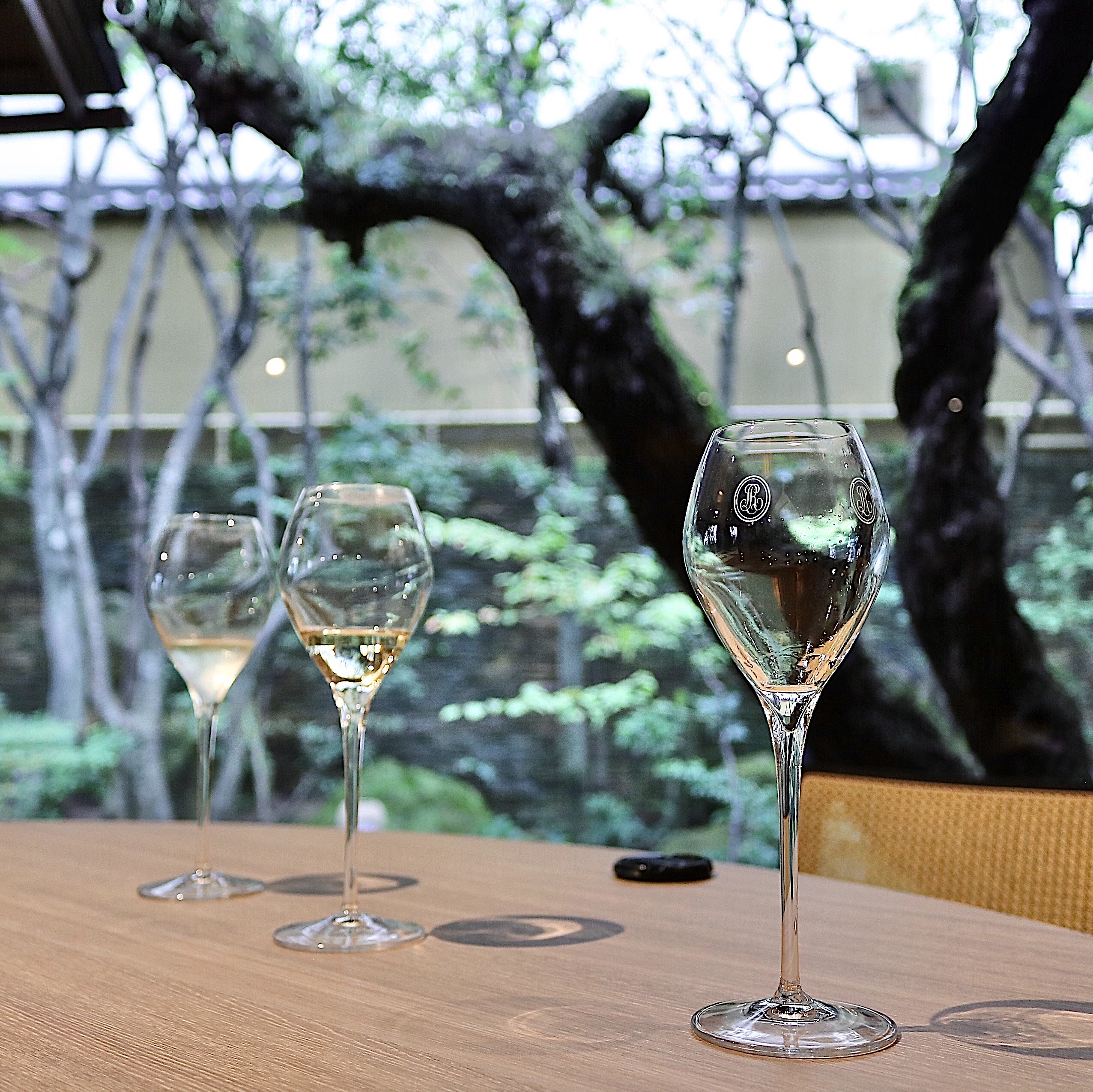 天井が高く開放感に満ちたダイニングエリア。大きな窓一面に日本庭園を臨み、美しい日本の四季を愛でながら、豊富に用意したワインとともにお料理をお楽しみいただけます。