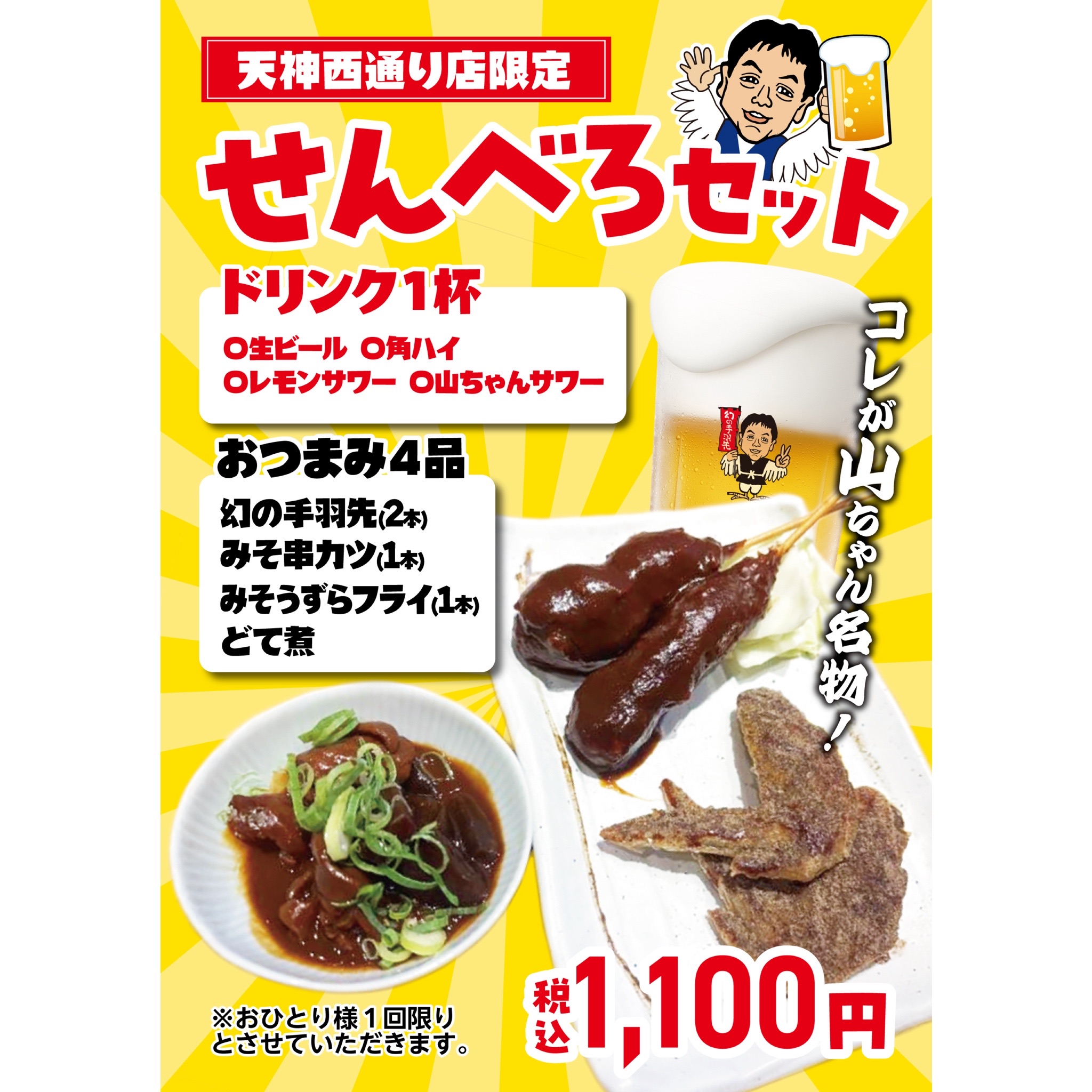 2025年4⽉26⽇(土)に福岡県福岡市中央区天神にグランドオープンした「世界の⼭ちゃん 天神⻄通り店」にて、天神⻄通り店限定の「せんべろセット」と「メガドリンク」を提供中です。