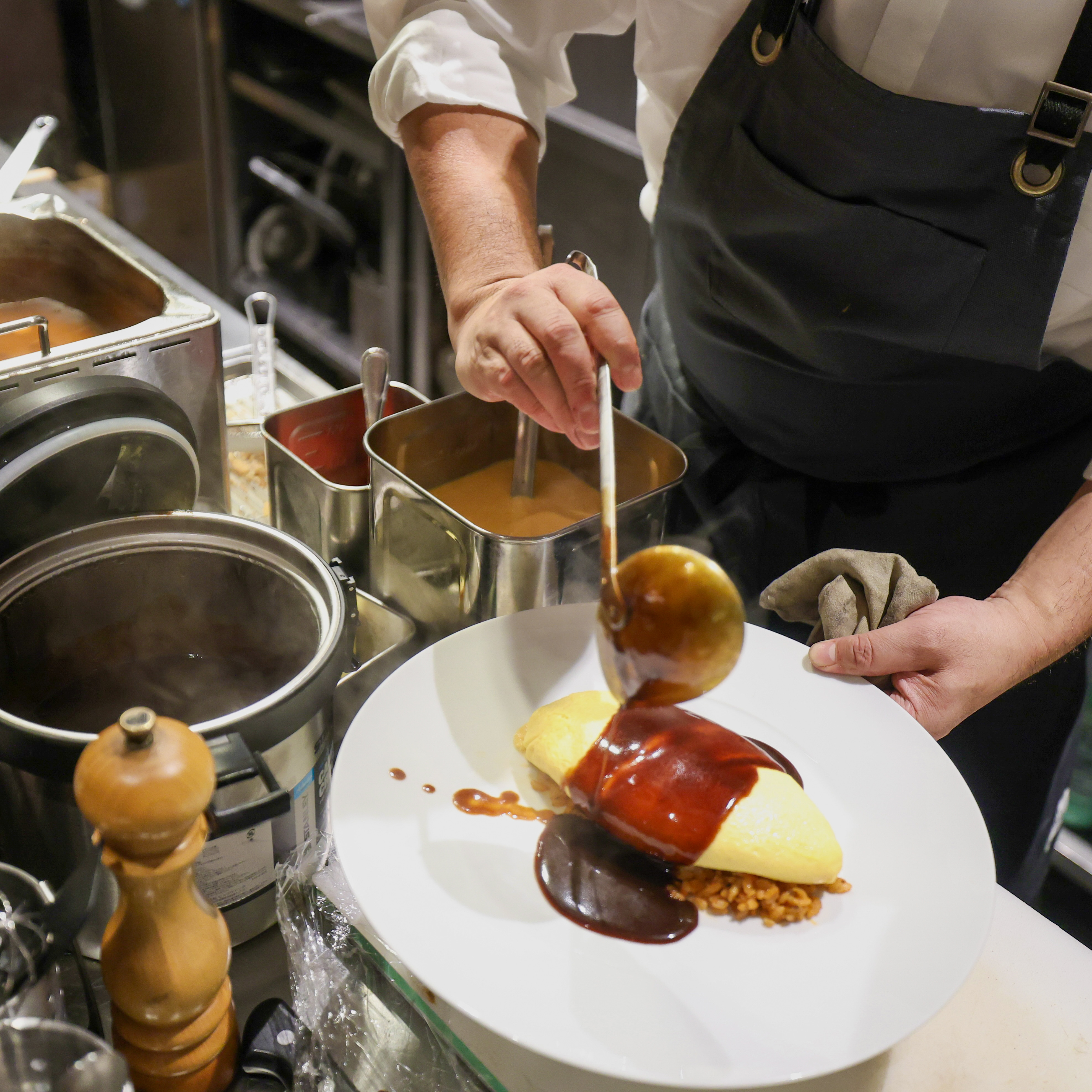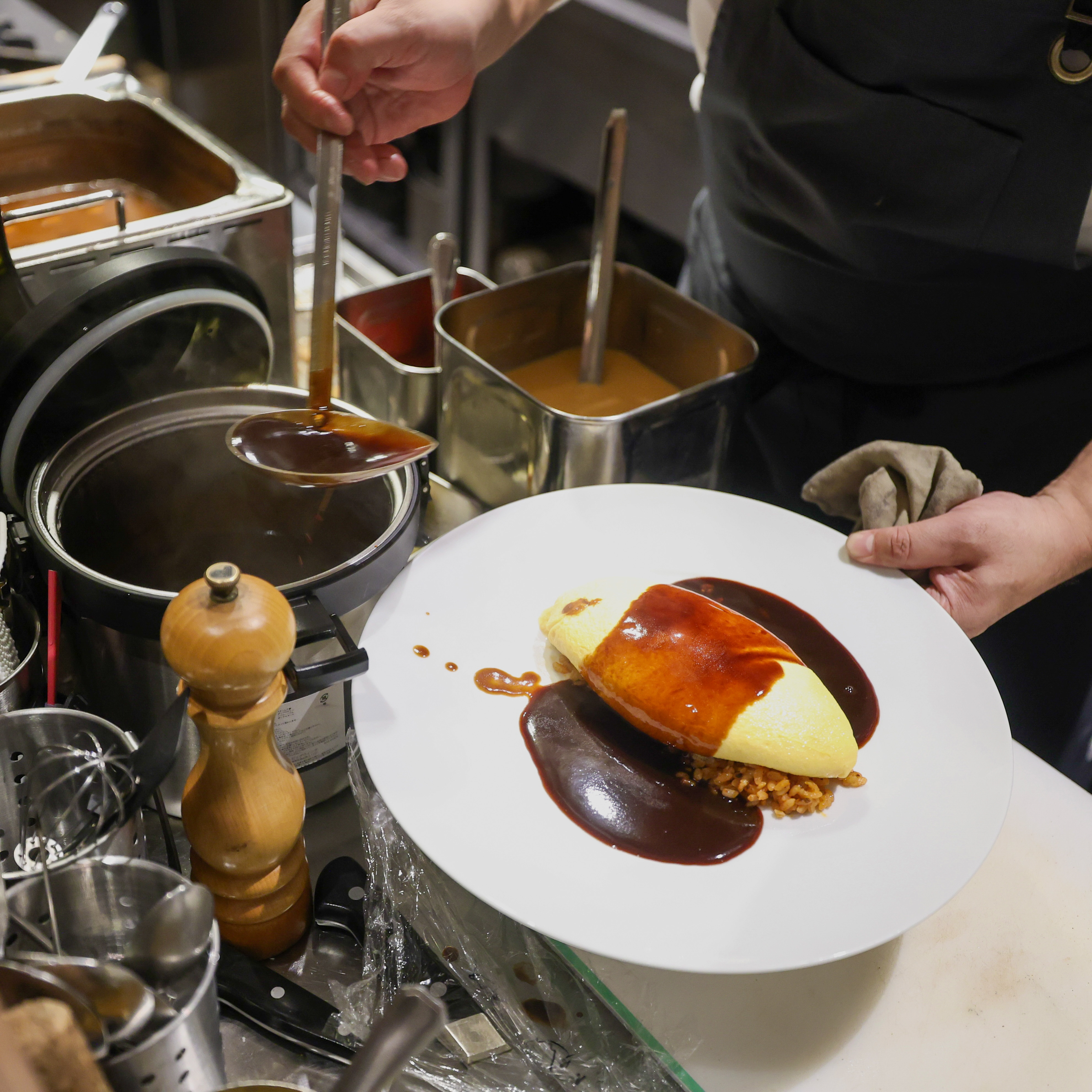 洋食の王道でもあるオムライスにもたっぷりのデミグラスソースをかければ、卵との相性が抜群で、シン プルでありながらとても深い味わいの大人向けオムライスの出来上がり。