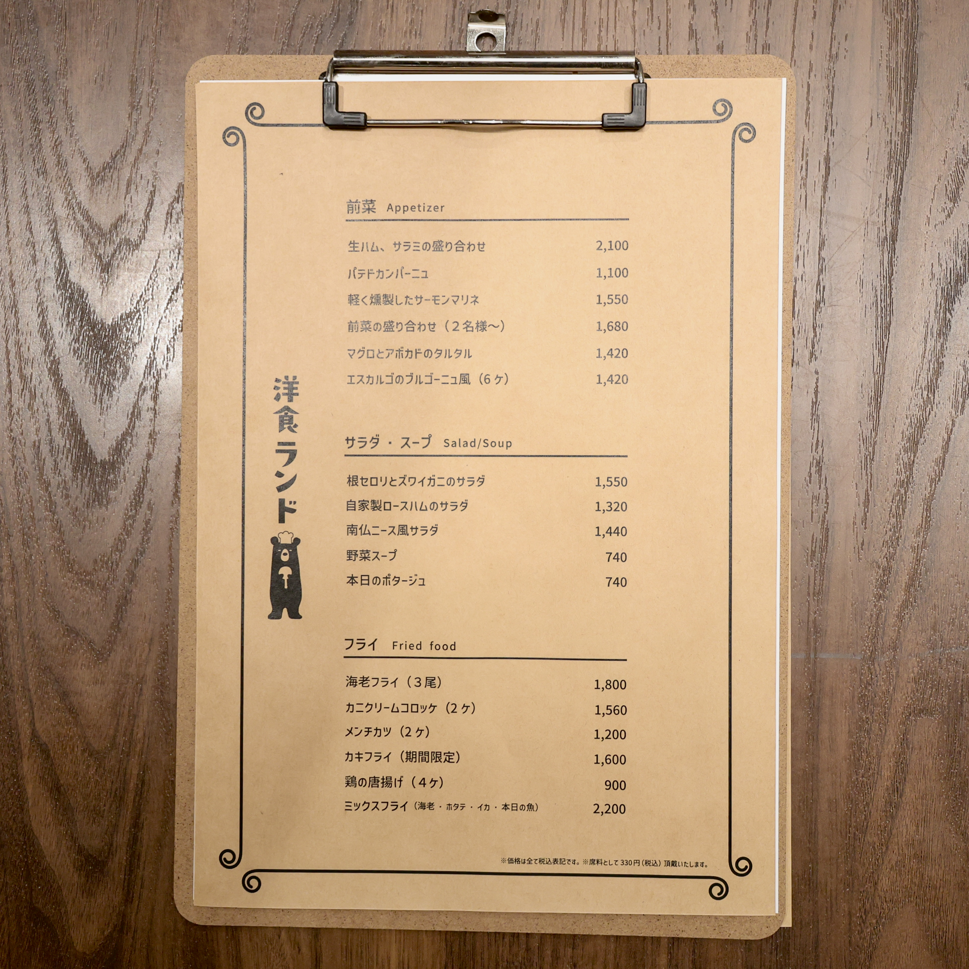 洋食ランドの前菜、サラダ・スープ、フライのメニュー。