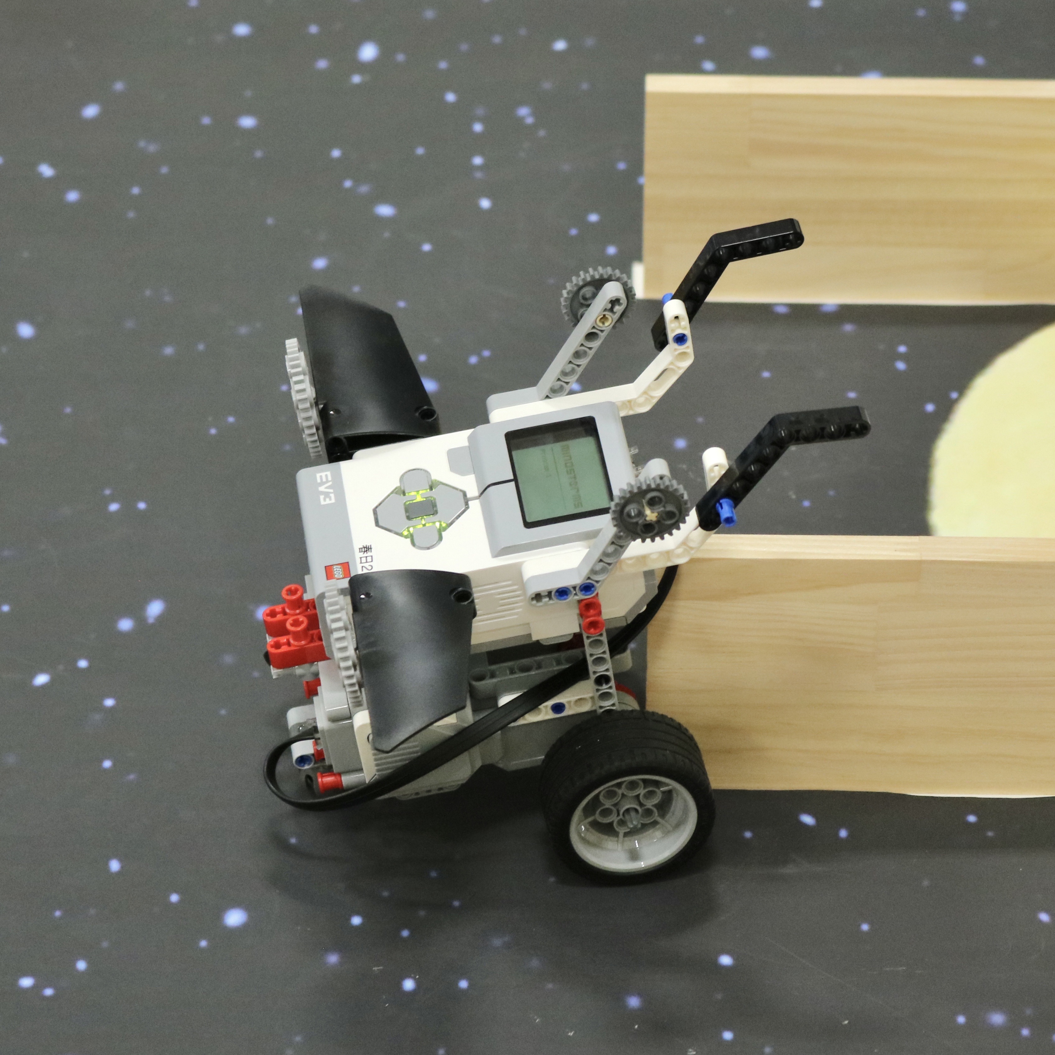 テーブルのふちギリギリでストップするようにプログラミングして、走行。