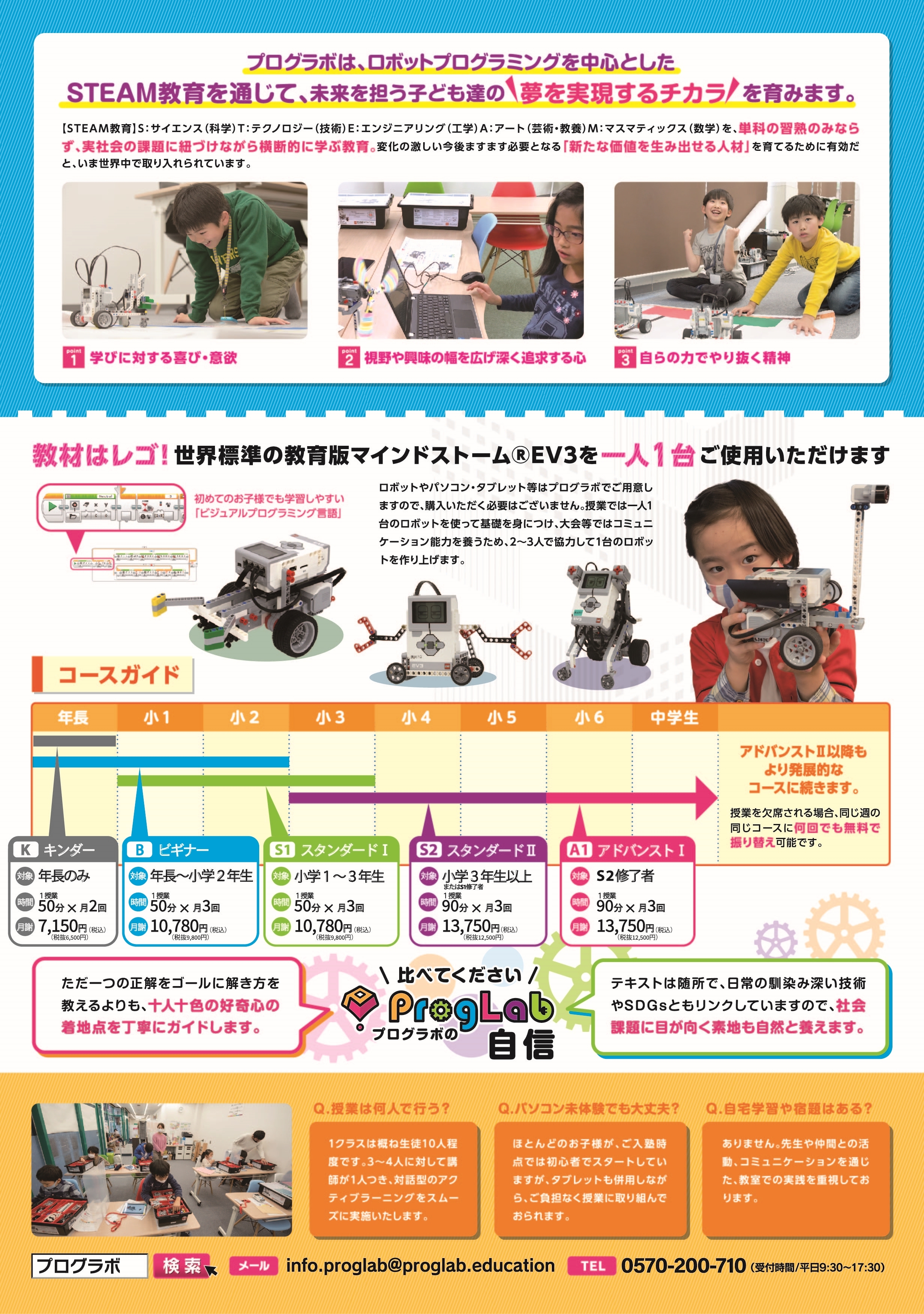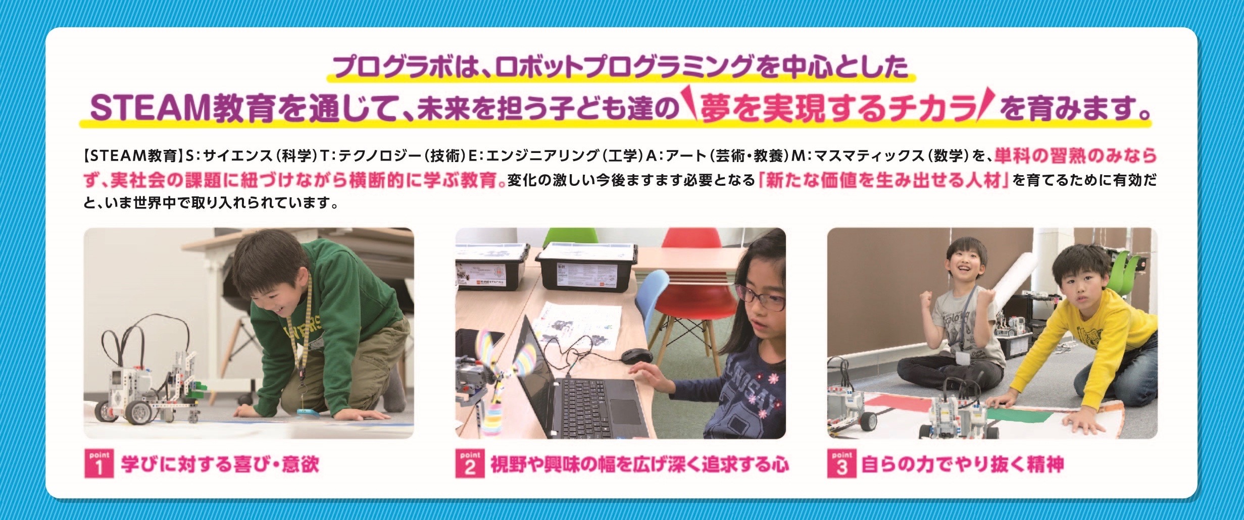 ■STEAM(スティーム)教育についてプログラボはロボットプログラミングを中心としたSTEAM教育を通じて、未来を担う子ども達の「夢を実現するチカラ」を育みます。