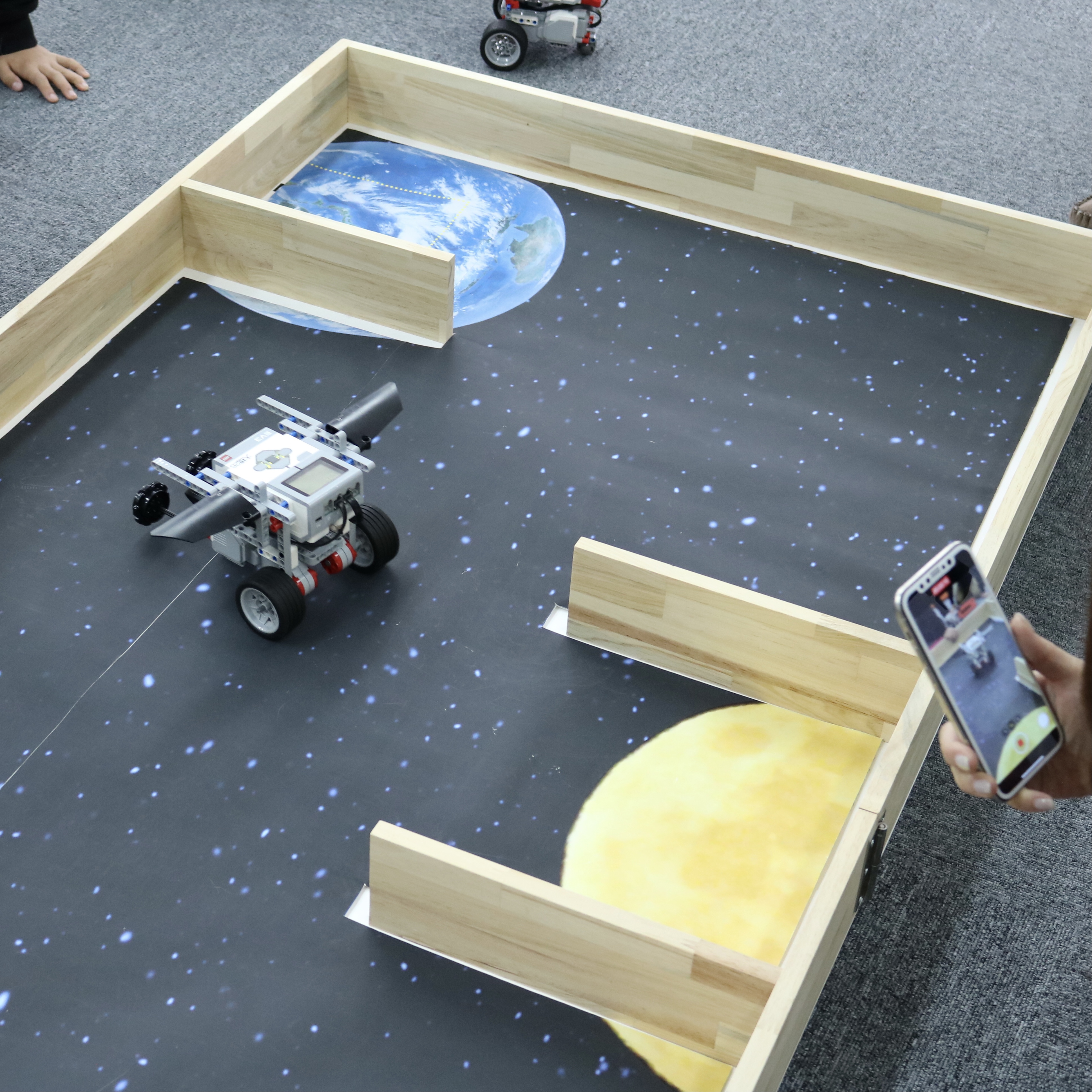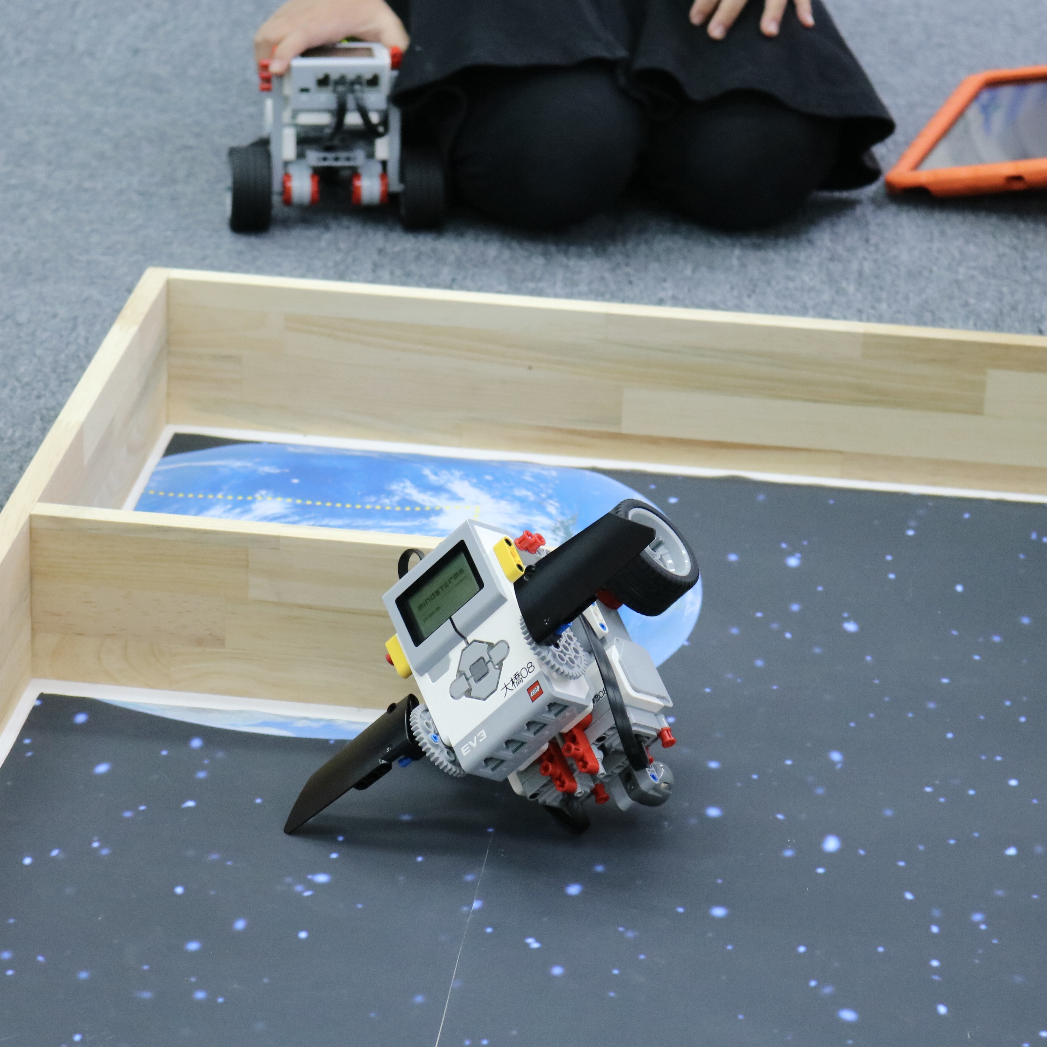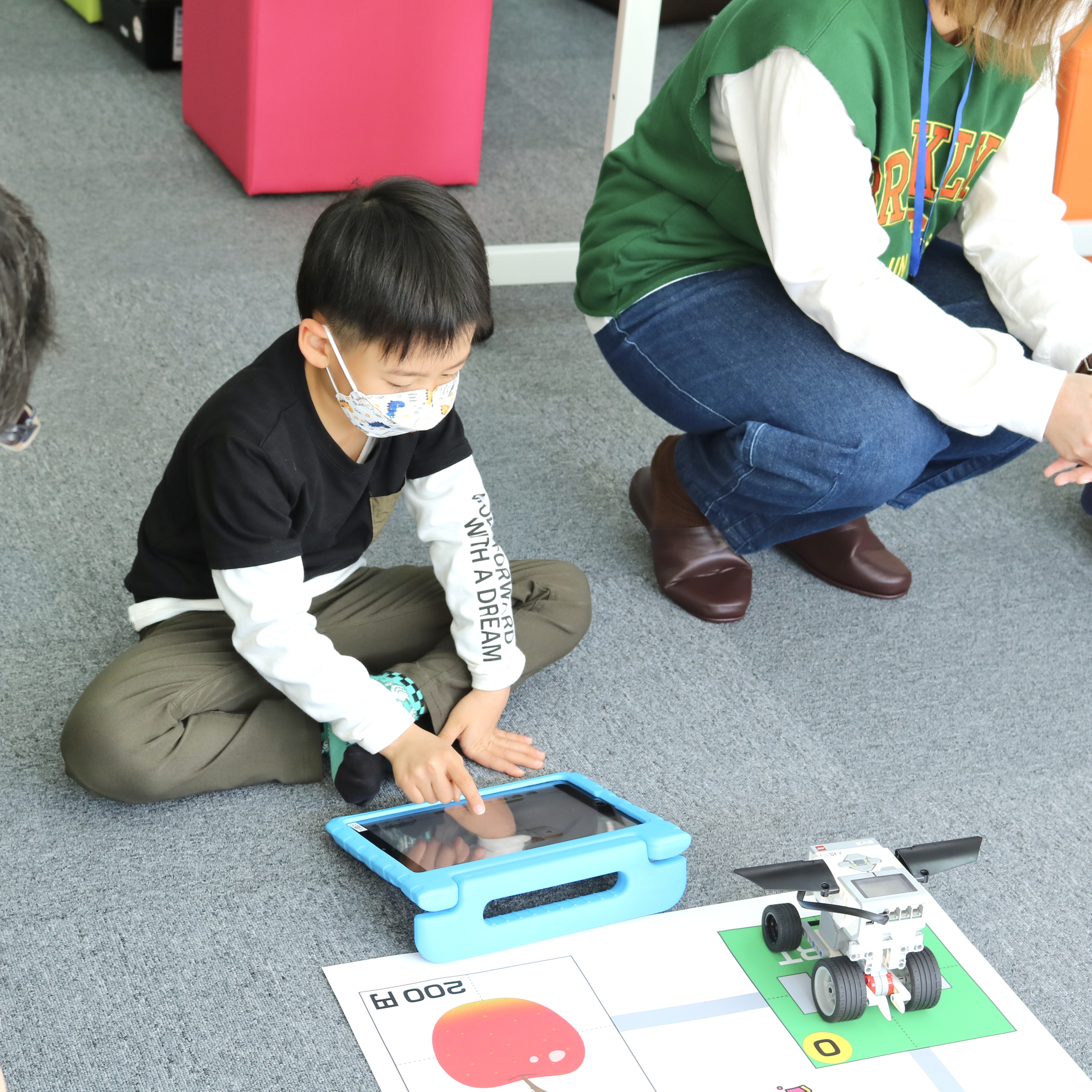 組み立てたロボットにプログラムを打ち込んで、シートの上を走らせます。