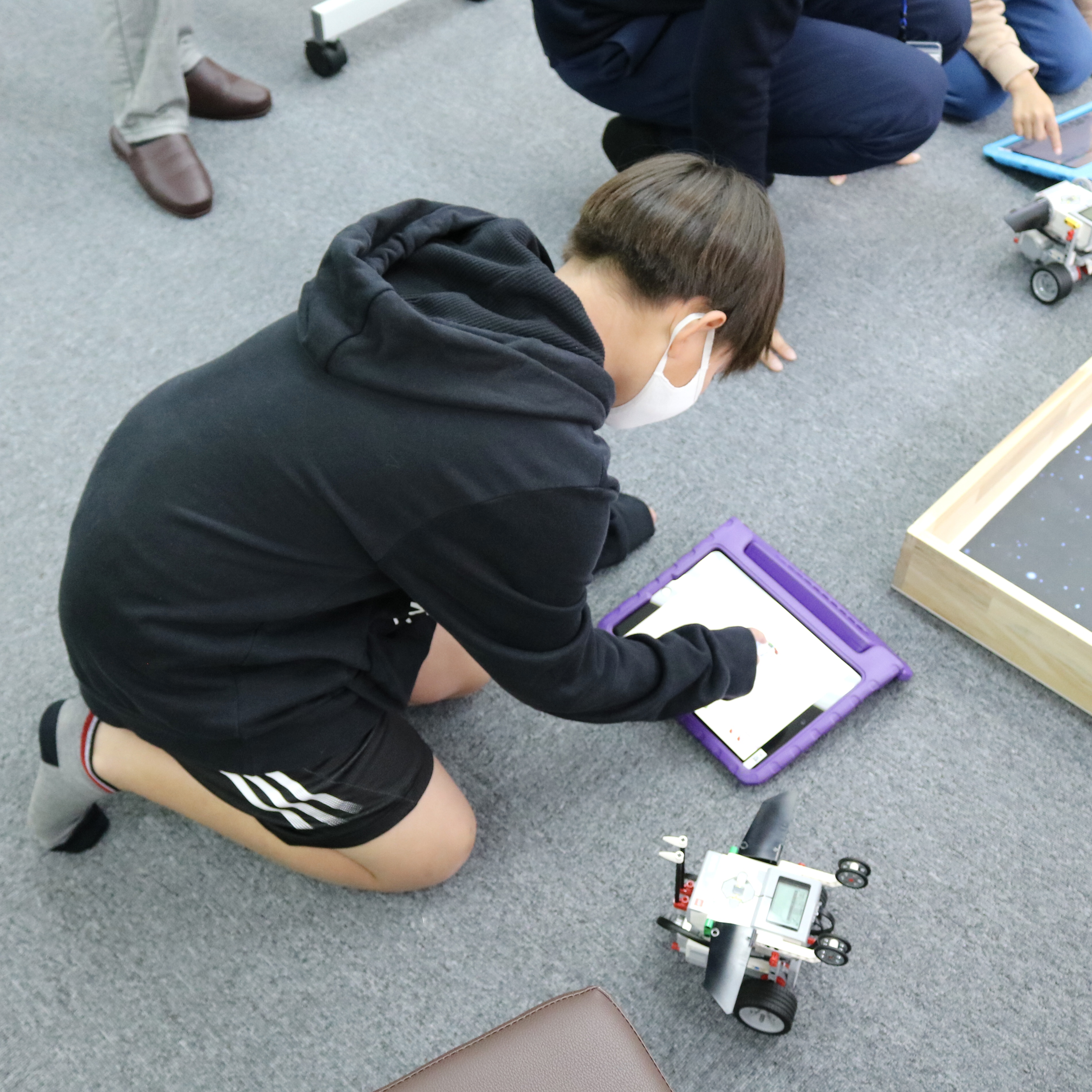 集中しすぎて、寝そべってプログラミングするお子さんもいました。