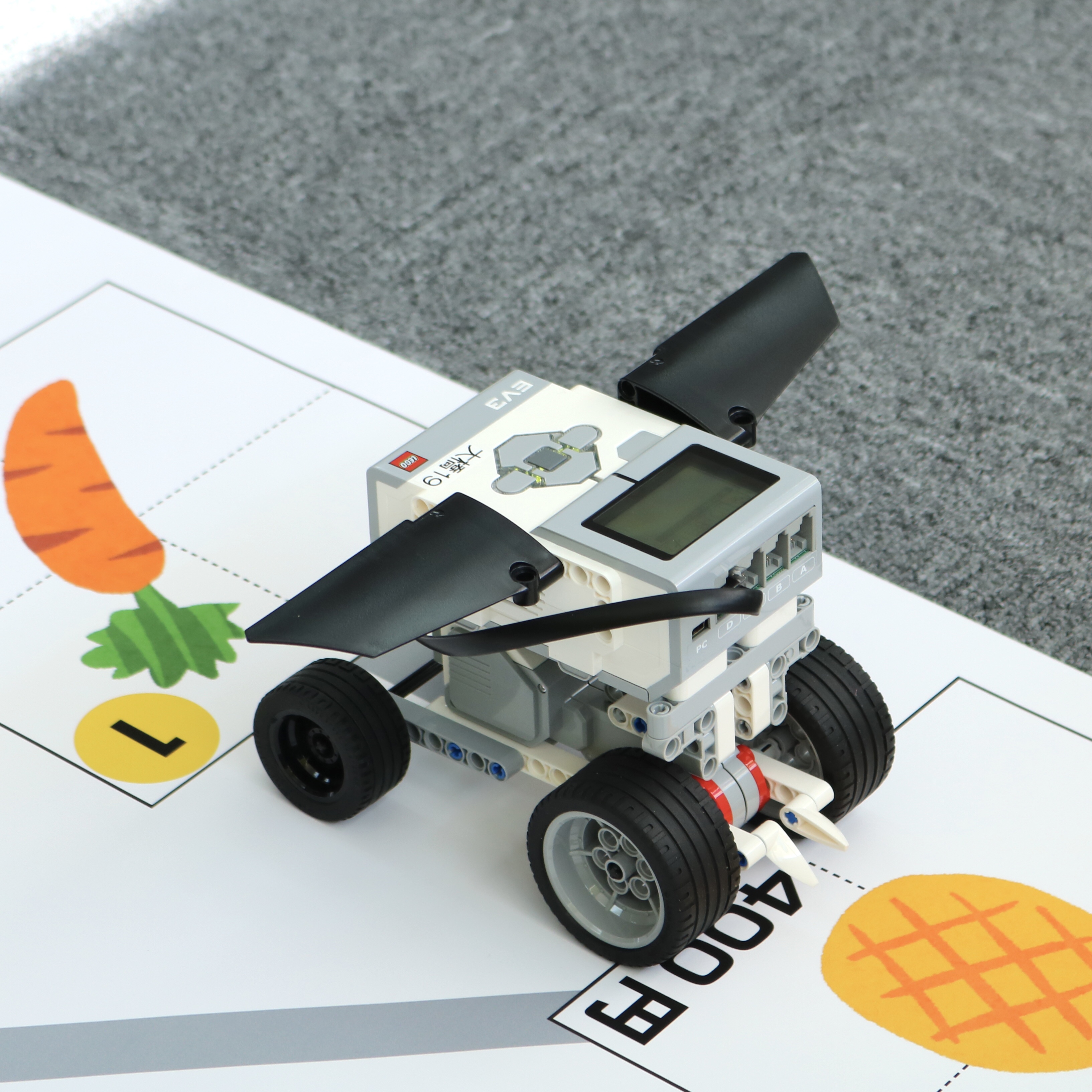 プログラミングされたロボットはシートの上を走行し、目的のマスを目指します。