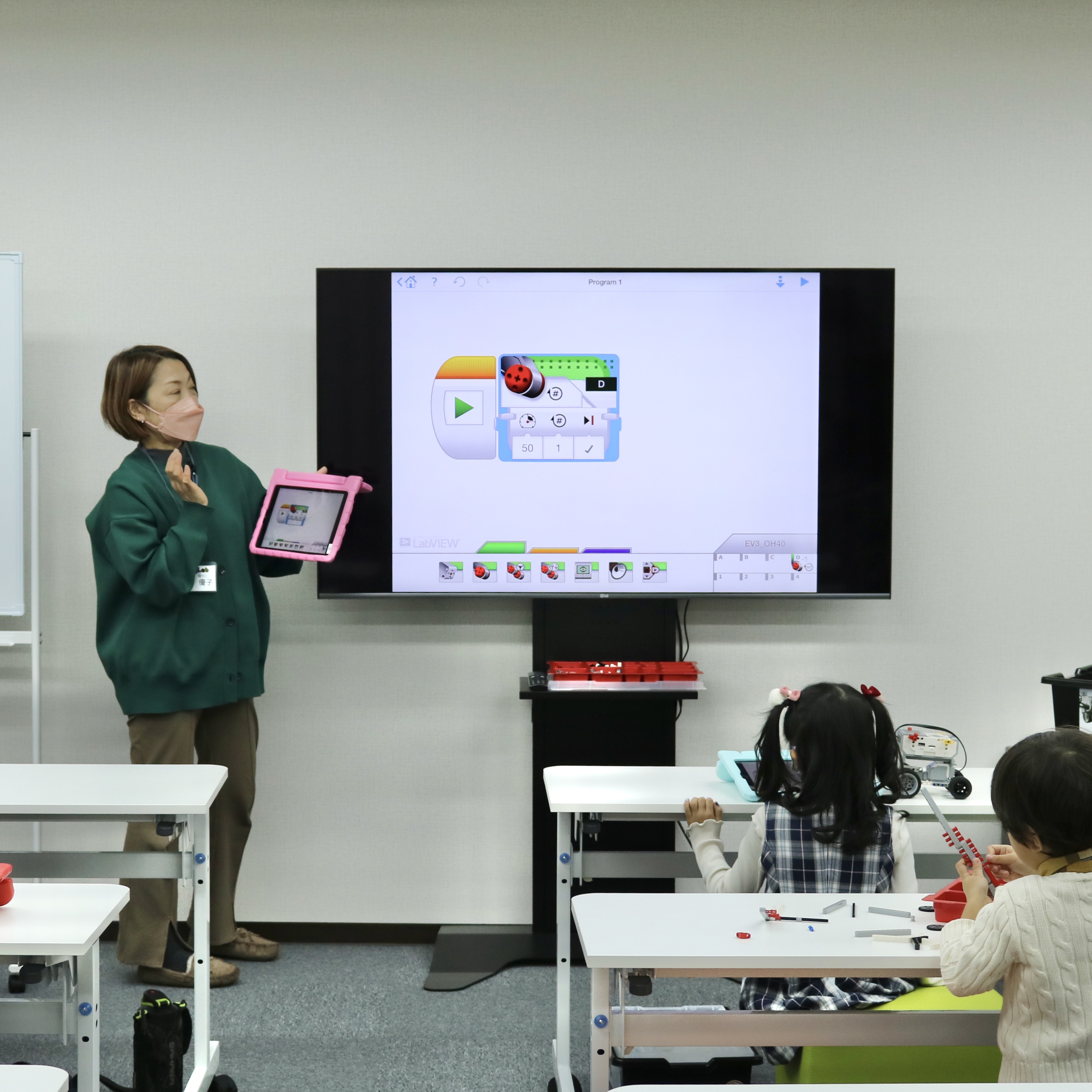 講師の方が大型モニターを使って、iPadでのプログラミング方法を教えてくださいます。