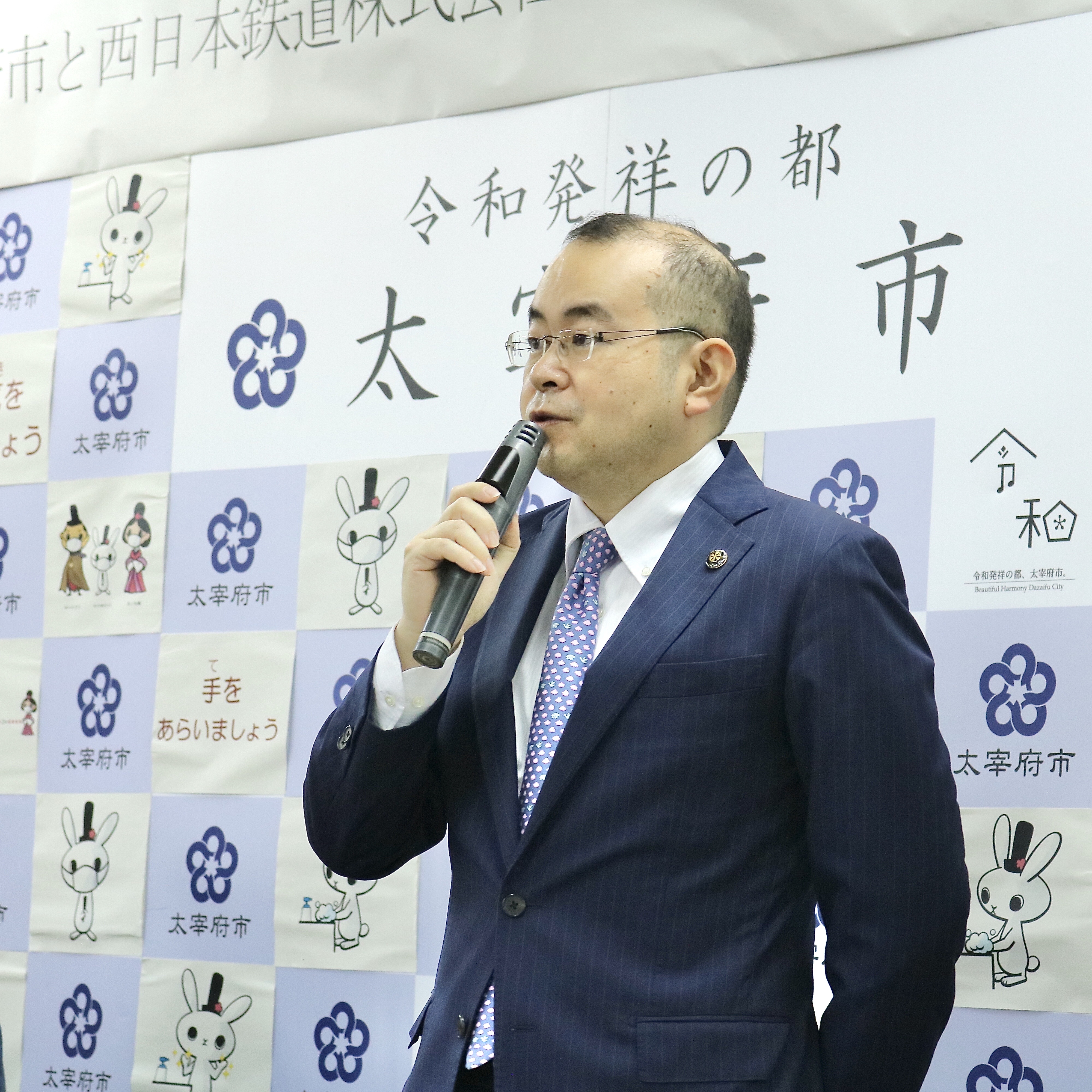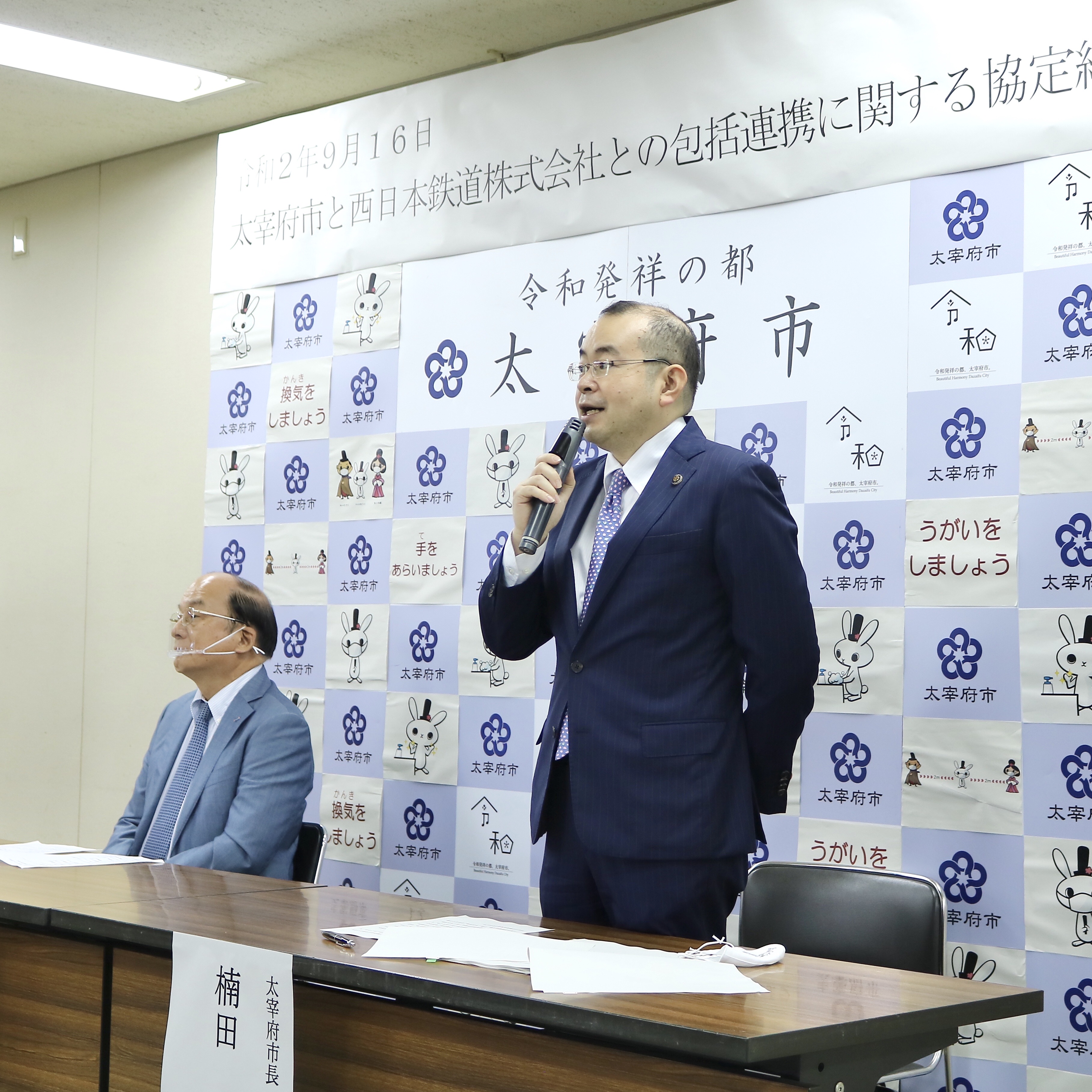 「太宰府市は日本有数の観光地で、鉄道やバス事業だけでなく、ホテルやレジャー、住宅事業も、西鉄電車沿線の重要な地域のひとつとして位置付けております。今後は、交通拠点の魅力向上・沿線活性化や観光・地域経済の振興、公共交通の維持・利用促進、移住・定住の促進に関し、協働して取り組みを行い、沿線の魅力・利便性向上に努めるとともに、太宰府市の持続的発展に向けたまちづくりに貢献してまいります。」