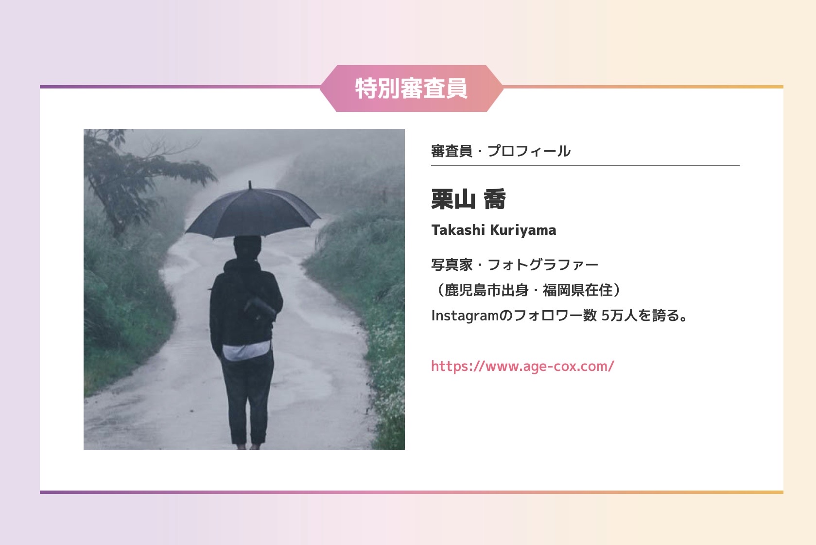 特別審査員は、昨年に引き続き、九州を中心に活躍する写真家・フォトグラファーの「栗山 喬」氏と、“電柱作監”の愛称で親しまれるアニメーターの「田中 達也」氏が担当されます。