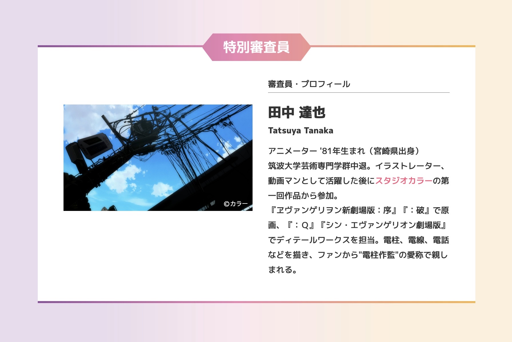 『ヱヴァンゲリヲン新劇場版:序』『:破』で原画、『:Q』『シン・エヴァンゲリオン劇場版』でディテールワークスを担当。電柱、電線、電話などを描き、ファンから"電柱作監"の愛称で親しまれる。