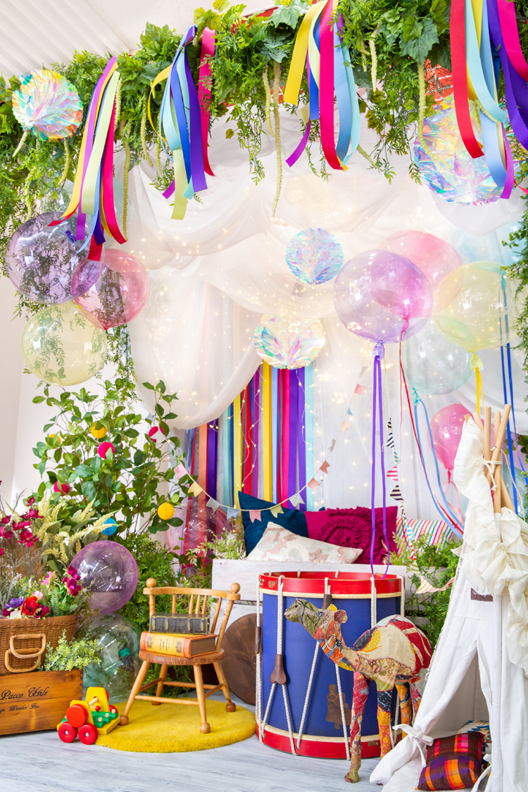 「見て!あっちにキラキラした丘があるよ」「このまま飛んでいっちゃおう」虹の滑り台をすべってたどり着いたのは、ビジューの丘。宝石のように輝く色とりどりの世界に2人はニッコリ。