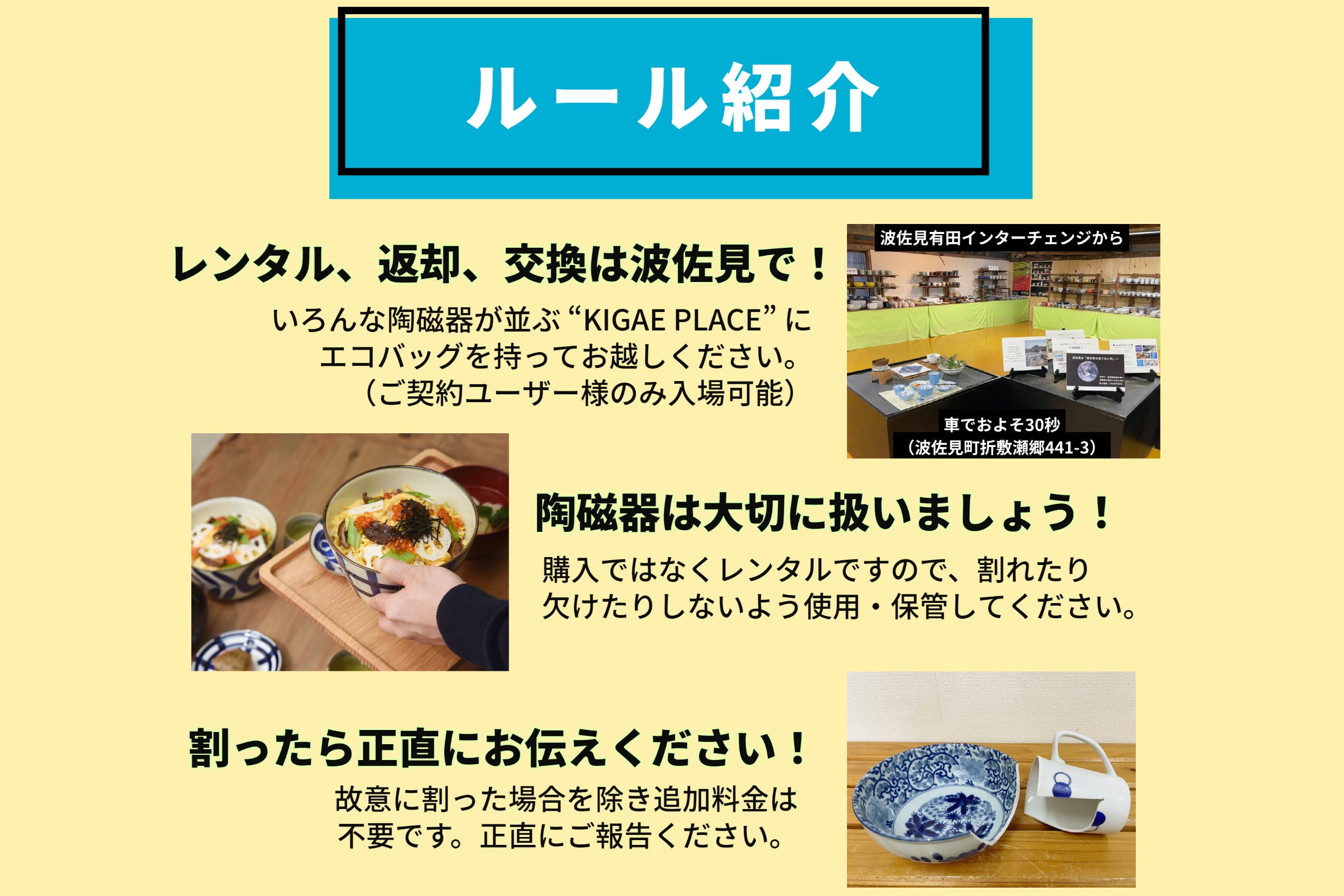 陶磁器のレンタル、返却、交換は波佐見有田インターチェンジそばの会場「KIGAE PLACE」で対応いたします。