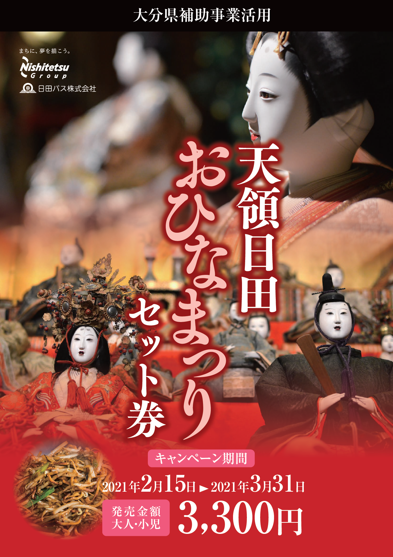 天領日田おひなまつりセット券は、福岡〜日田間の高速バス往復乗車券と「天領日田おひなめぐりクーポン」、「日田やきそば食べ比べプラン(ハーフサイズ2食)」がセットになったもので、実質約43%OFFの特典となります。