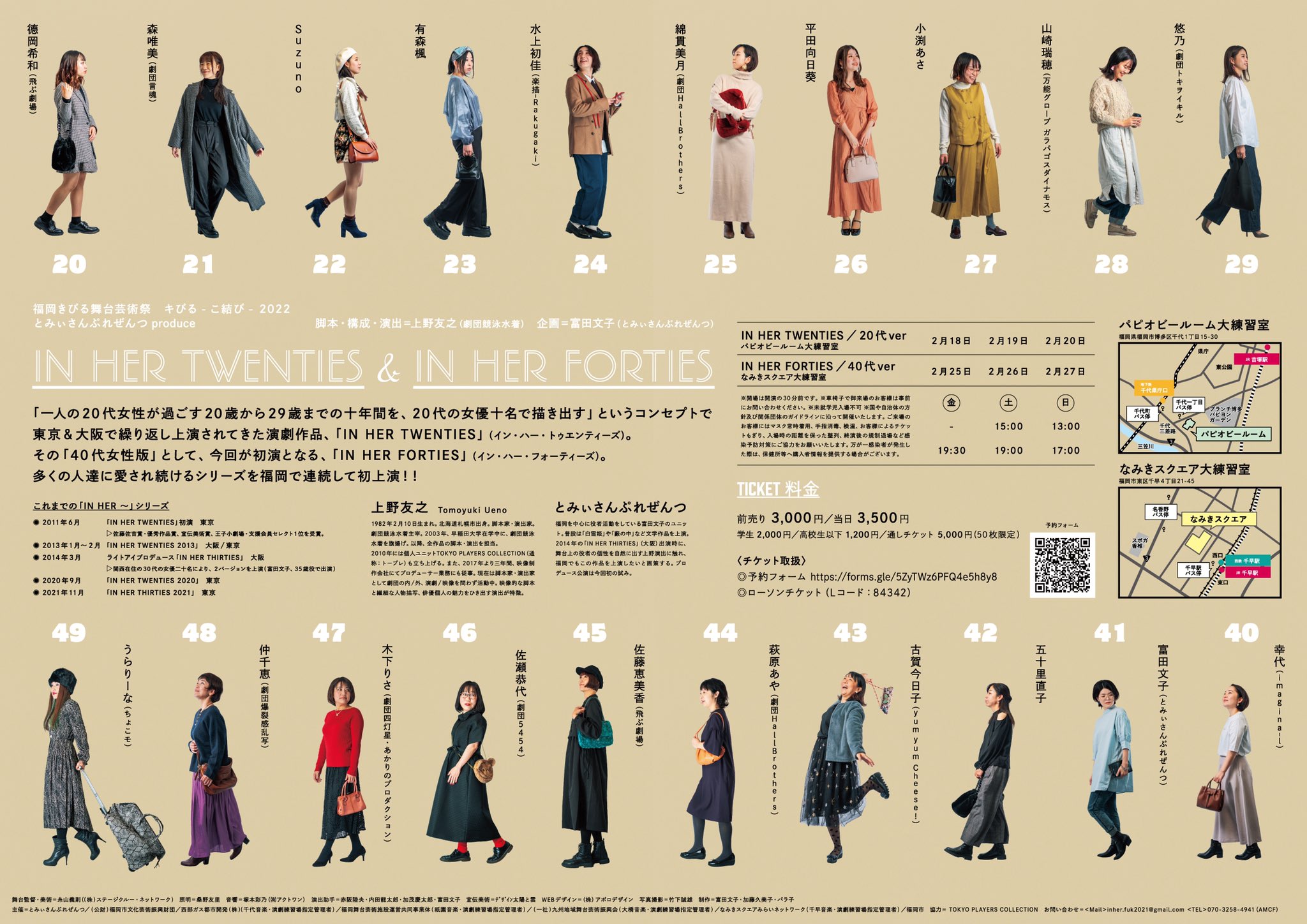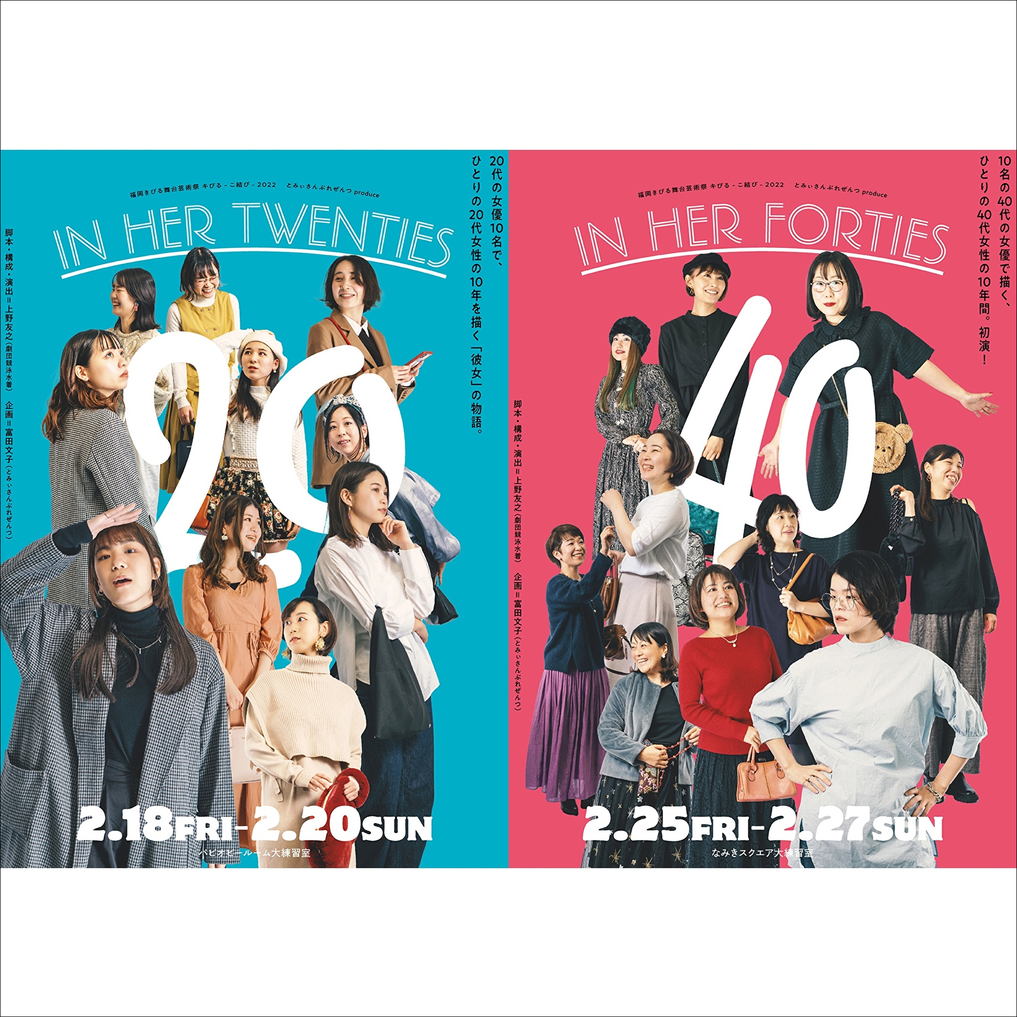 2022年2月18日(金)〜20日(日)に福岡市博多区千代のパピオビールーム大練習室で舞台「IN HER TWENTIES」(イン・ハー・トゥエンティーズ)が、2月25日(金)〜27日(日)に福岡市東区千早のなみきスクエア大練習室で舞台「IN HER FORTIES」(イン・ハー・フォーティーズ)が上演されます。
