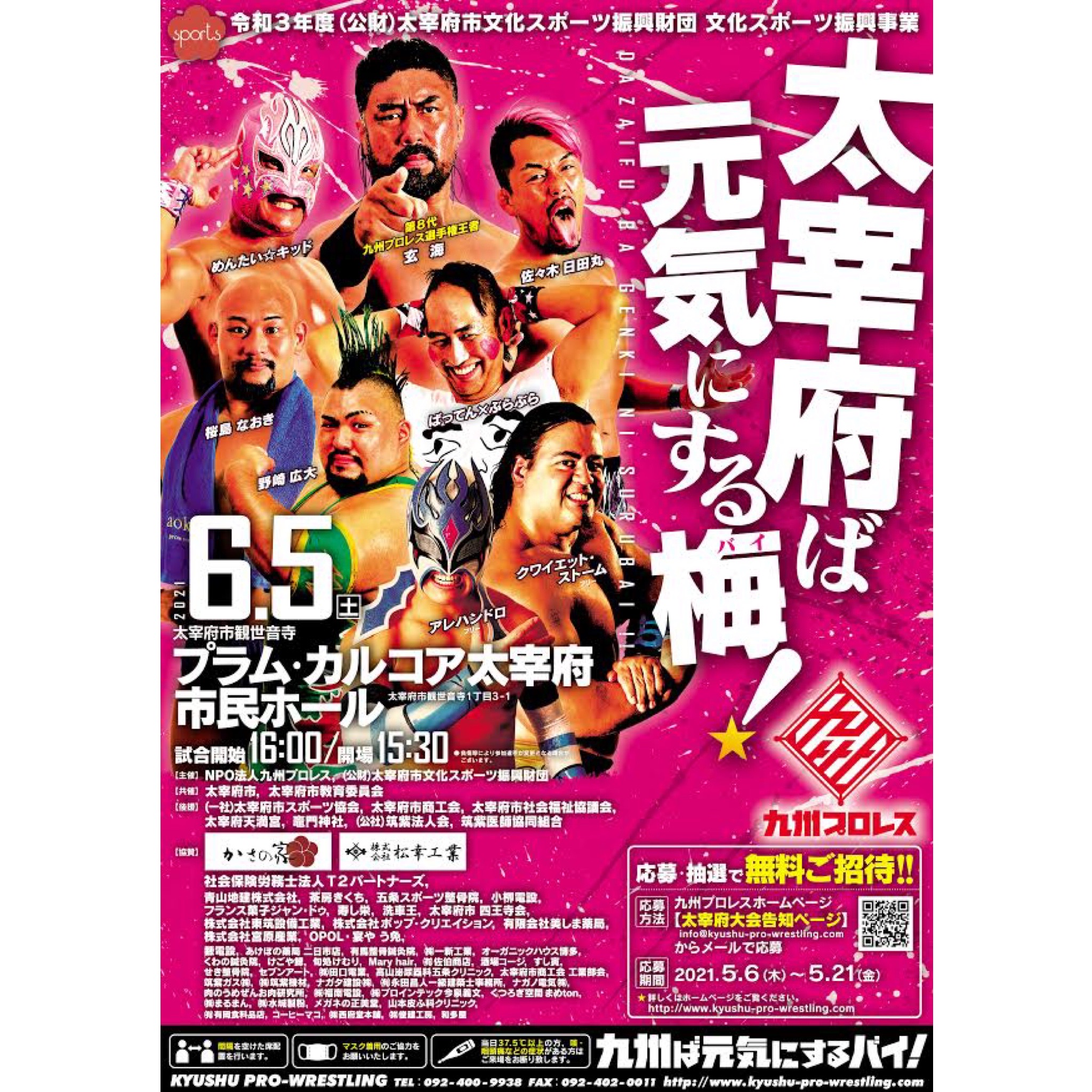 2021年6月5日(土)、福岡県太宰府市観世音寺のプラム・カルコア太宰府にて、九州プロレス「太宰府ば元気にする梅!」が開催されます。