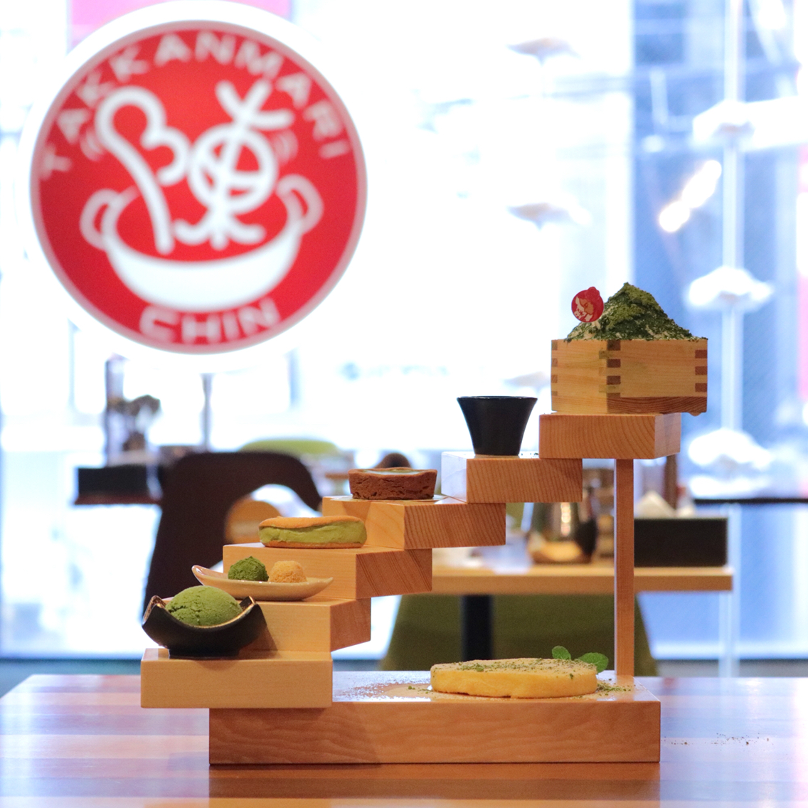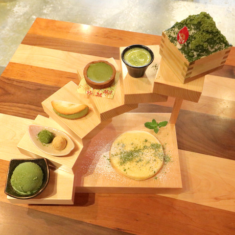 KIWAMI抹茶タワーのは木製のタワーの器に、パンケーキ、抹茶アイス、抹茶お団子、抹茶オムレット、抹茶タルト、抹茶ソース、KIWAMI 抹茶雪物語がセットになった、新発売の商品も含めた抹茶商品づくしの新メニューです。