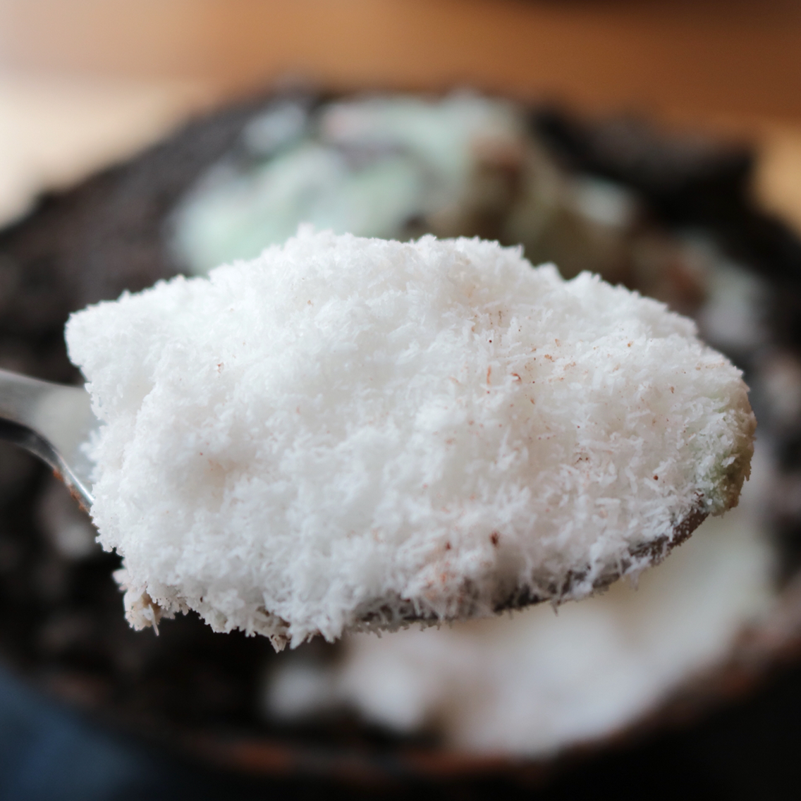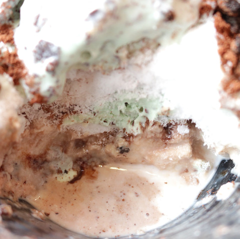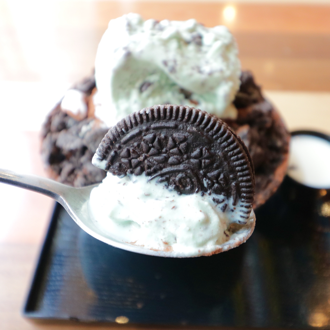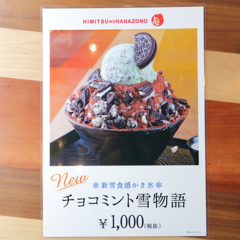 「新雪食感かき氷」ということで、パウダースノーのようななめらかな氷に、チョコミントアイス、チョコレートクリームクッキー、チョコレートパウダー、オリジナルのミルクを使用した、チョコづくしのかき氷です。