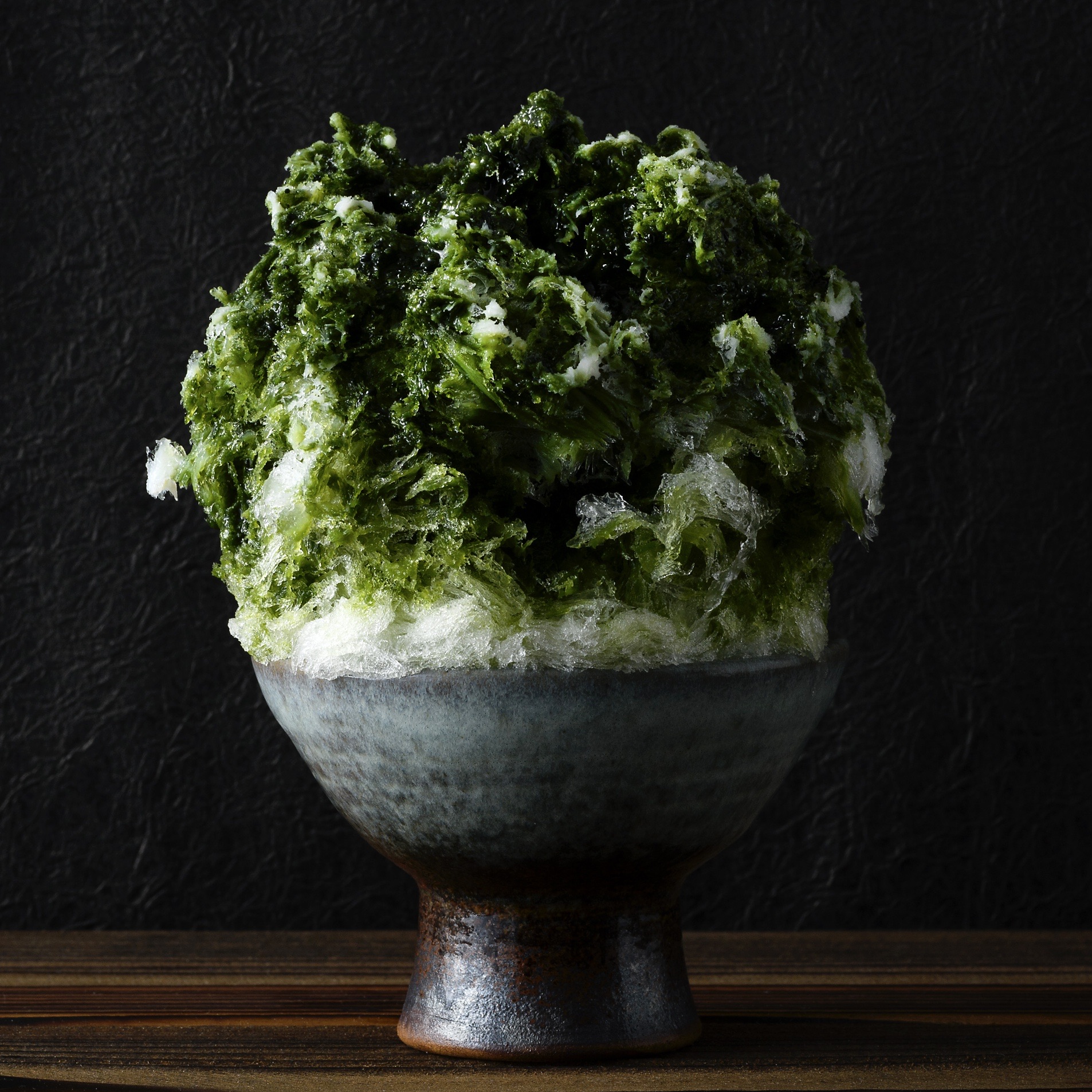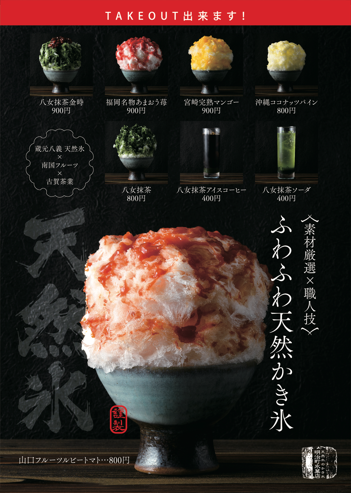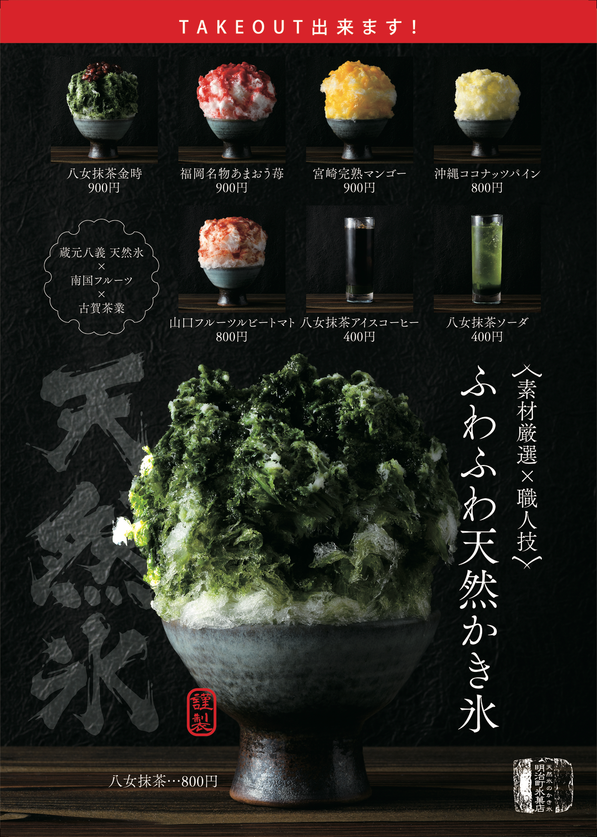 「天然氷のかき氷 明治町氷菓店」は、福岡の「博多もつ鍋 芳々亭(よしよしてい)」が提供するかき氷ブランドで、氷は南アルプス・八ヶ岳の天然氷の「蔵元八義(くらもとやつよし)」を使用、シロップは九州が誇る果物店「南国フルーツ」の産地を特定できる自然味溢れる果物から作り、氷の味の王道「抹茶」は、福岡八女茶の老舗「古賀茶業」の抹茶を使用しています。