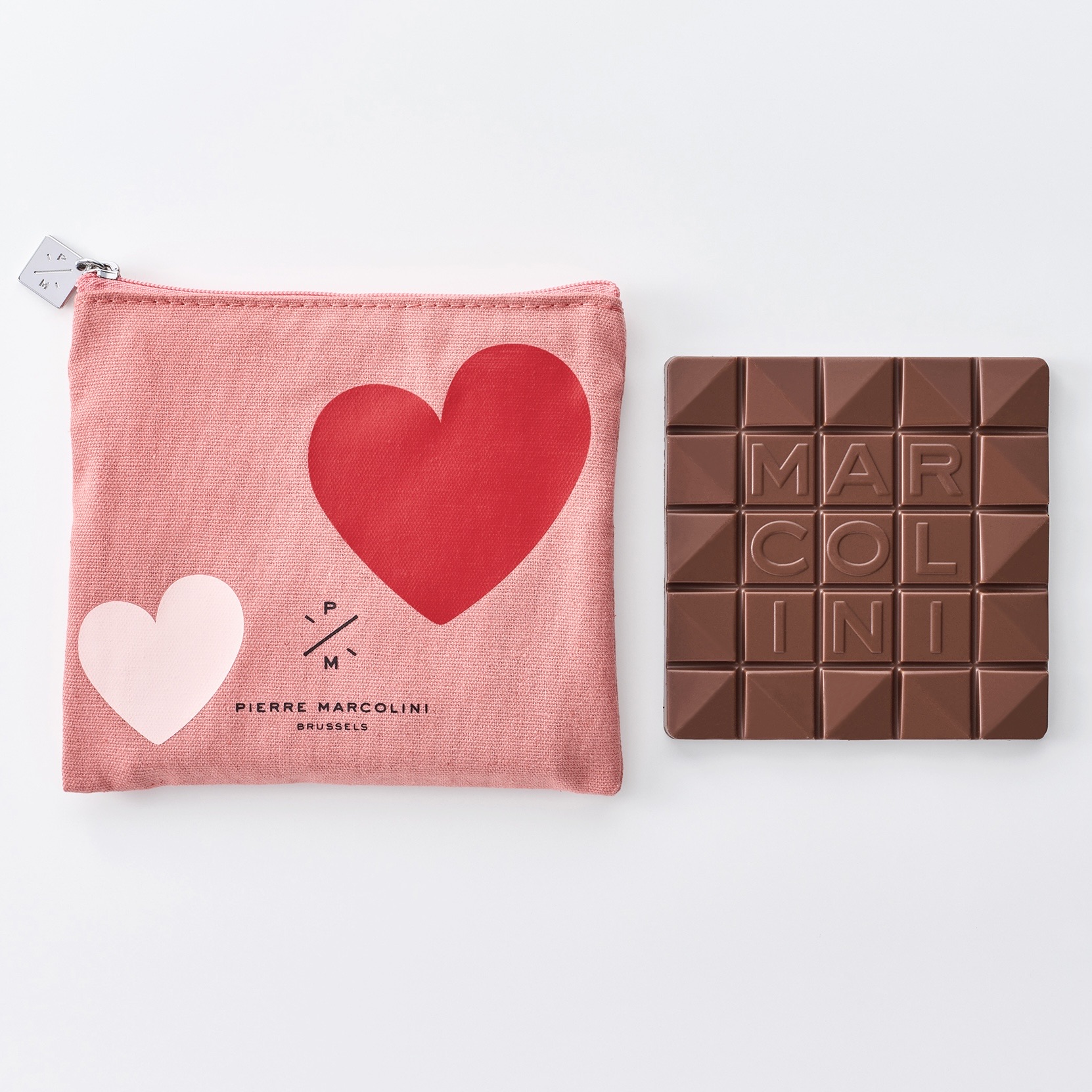 チョコレートの味わいをダイレクトに楽しめるタブレット ショコラを、アシンメトリーハートをあしらったバレンタイン限定ポーチとセットにしました。