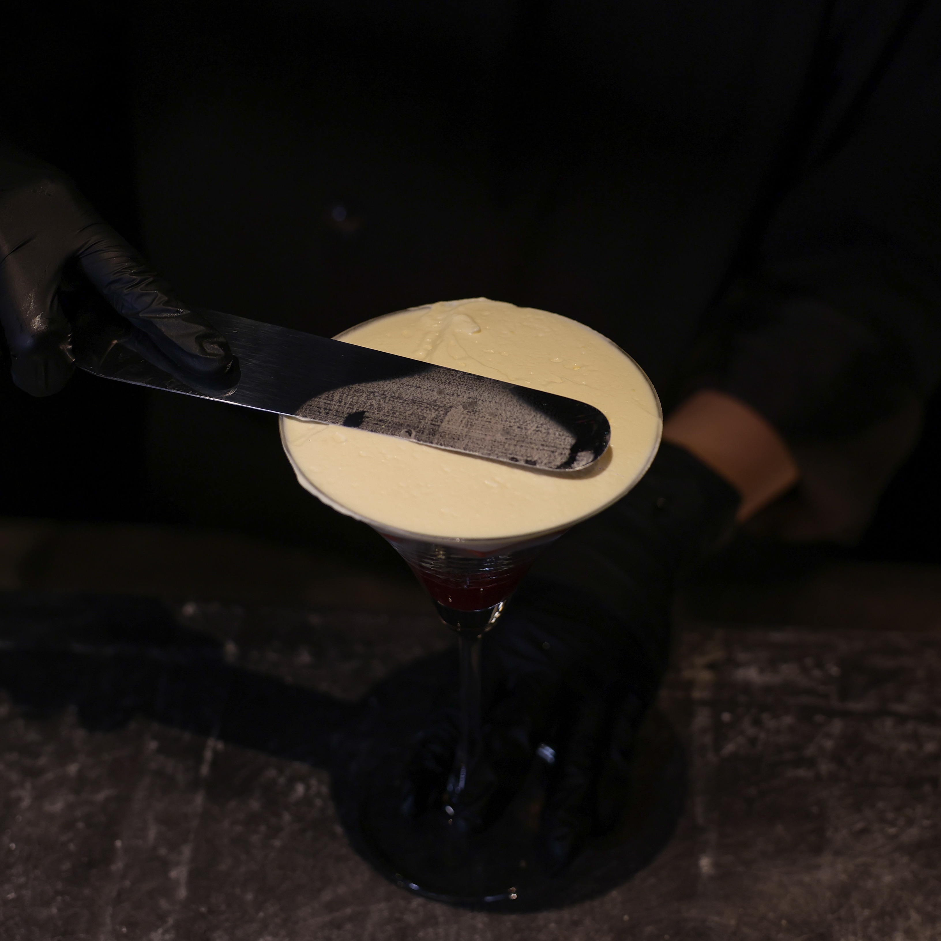 低温でじっくりと丁寧に抽出した八女茶をエスプーマにすることでクリーミーな味わいに仕立てました。そこへ貴醸酒「飛鸞」とパッションフルーツの果汁を合わせ、ソーダアップに。