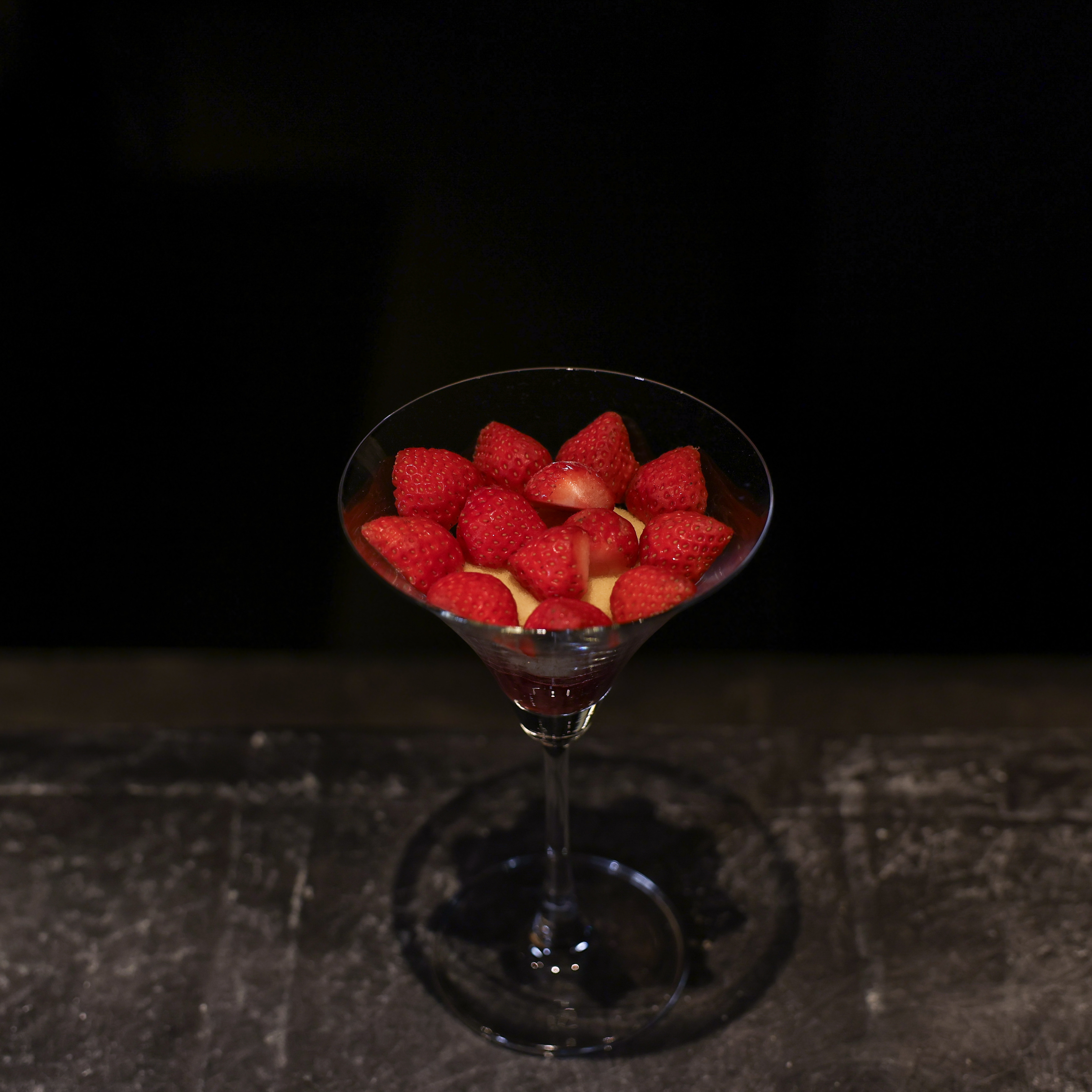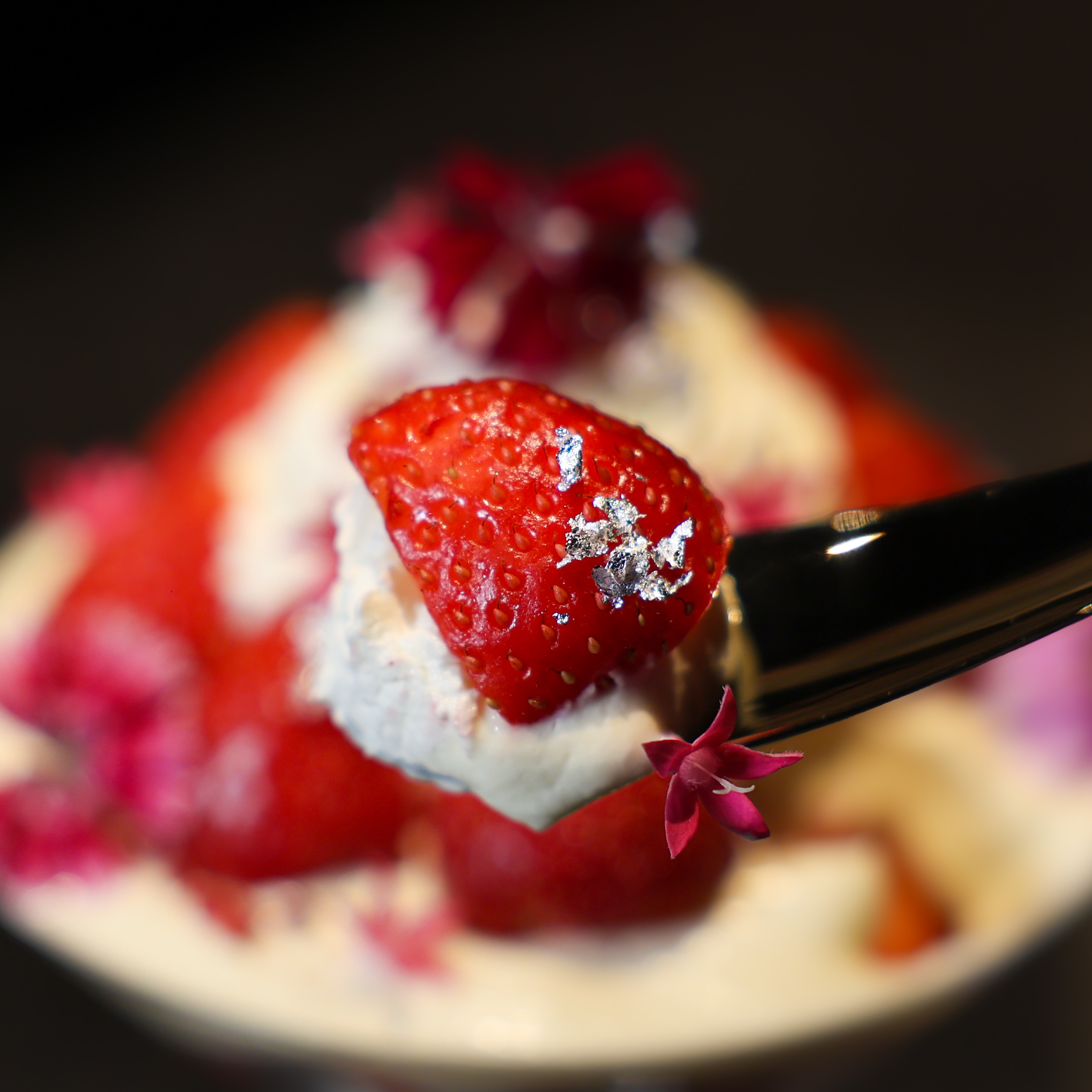 フランボワーズのジュレ、ザクザクとしたクランブル、アーモンド生地、たっぷりのイチゴ、アマレットムースを丁寧に敷き詰めたイチゴが輝く宝石のような華やかなパフェ。