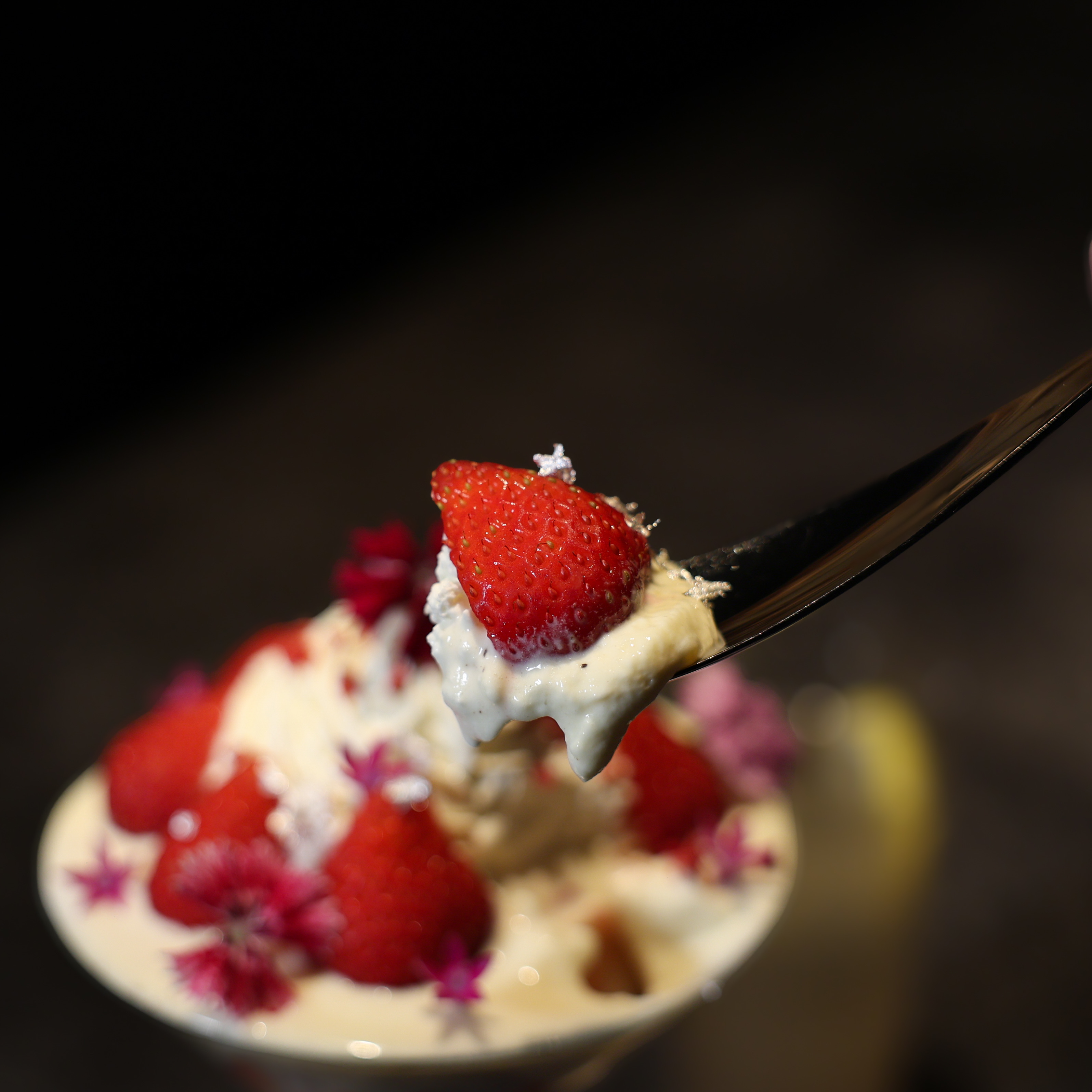 「イチゴの花畑パフェ」のイチゴやアーモンドの香りとのペアリングをお楽しみください。