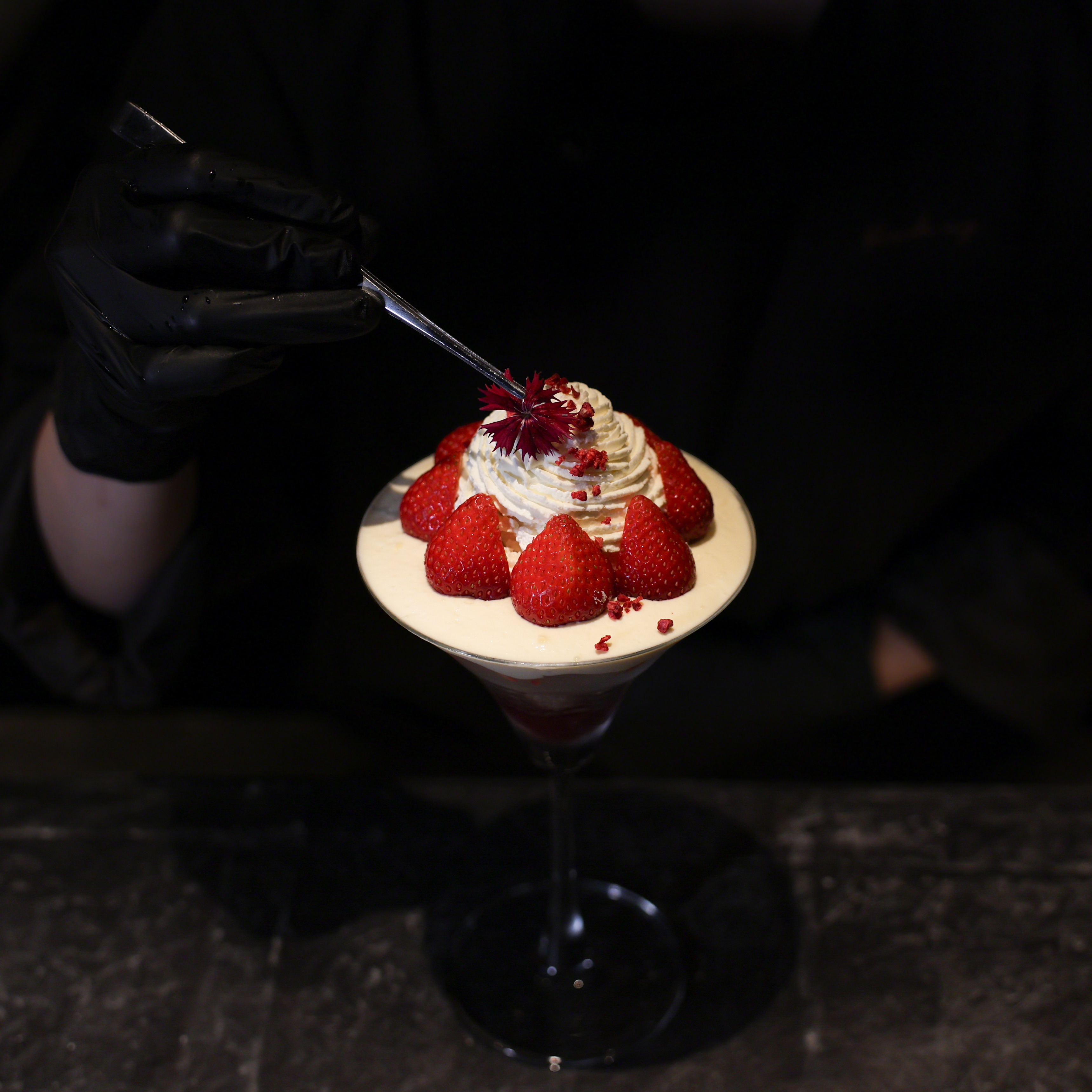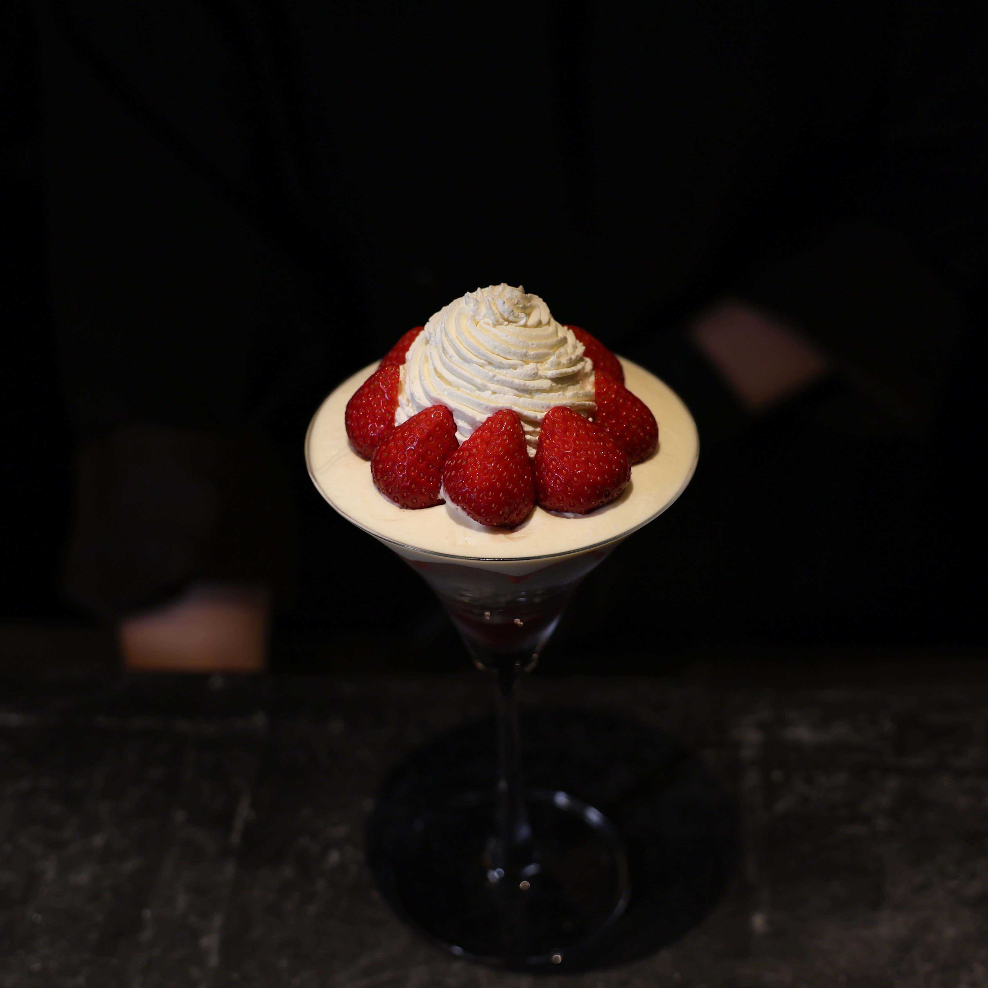 Takaeさんが「イチゴの花畑パフェ」とペアリングカクテル(アルコール)「アマレットジンジャー」をいただきました。
