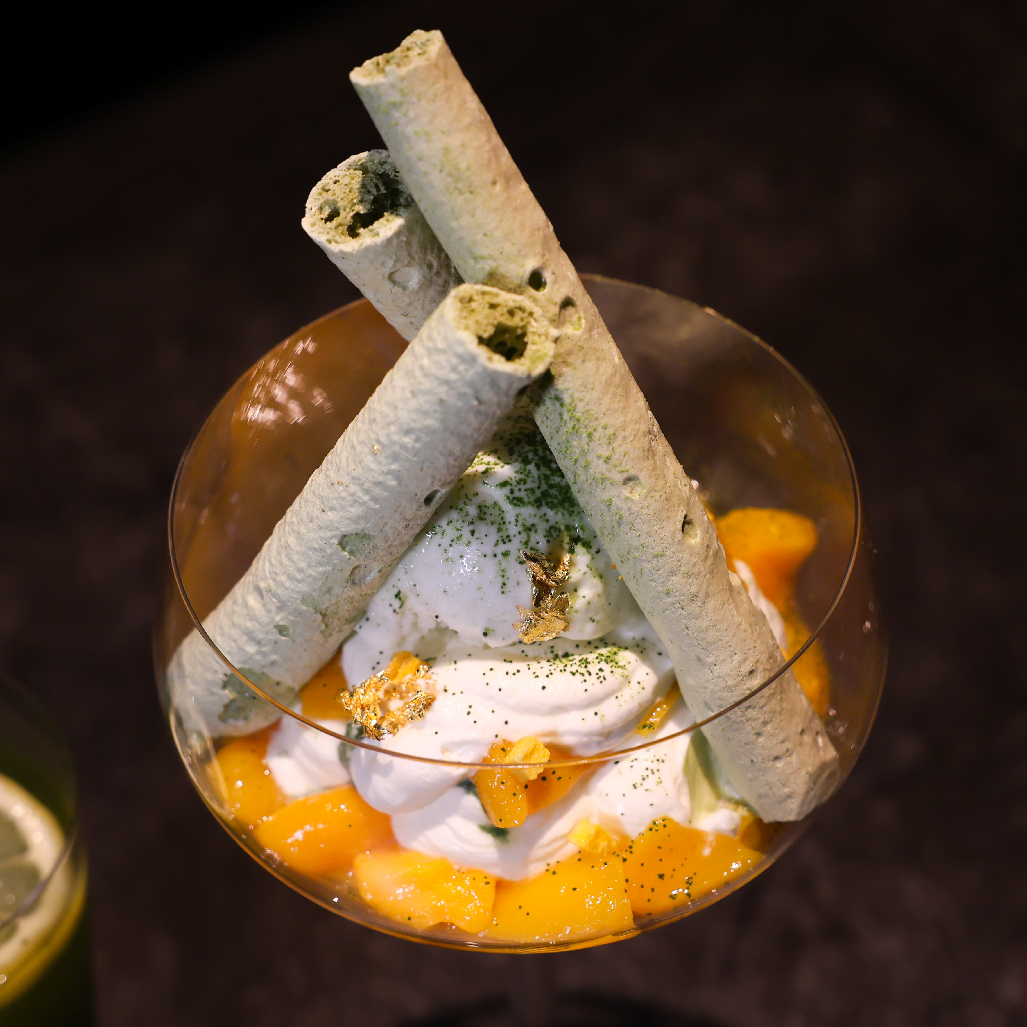 宮崎県産の完熟マンゴーと八女の白折茶を合わせたティラミス仕立てのパフェ。