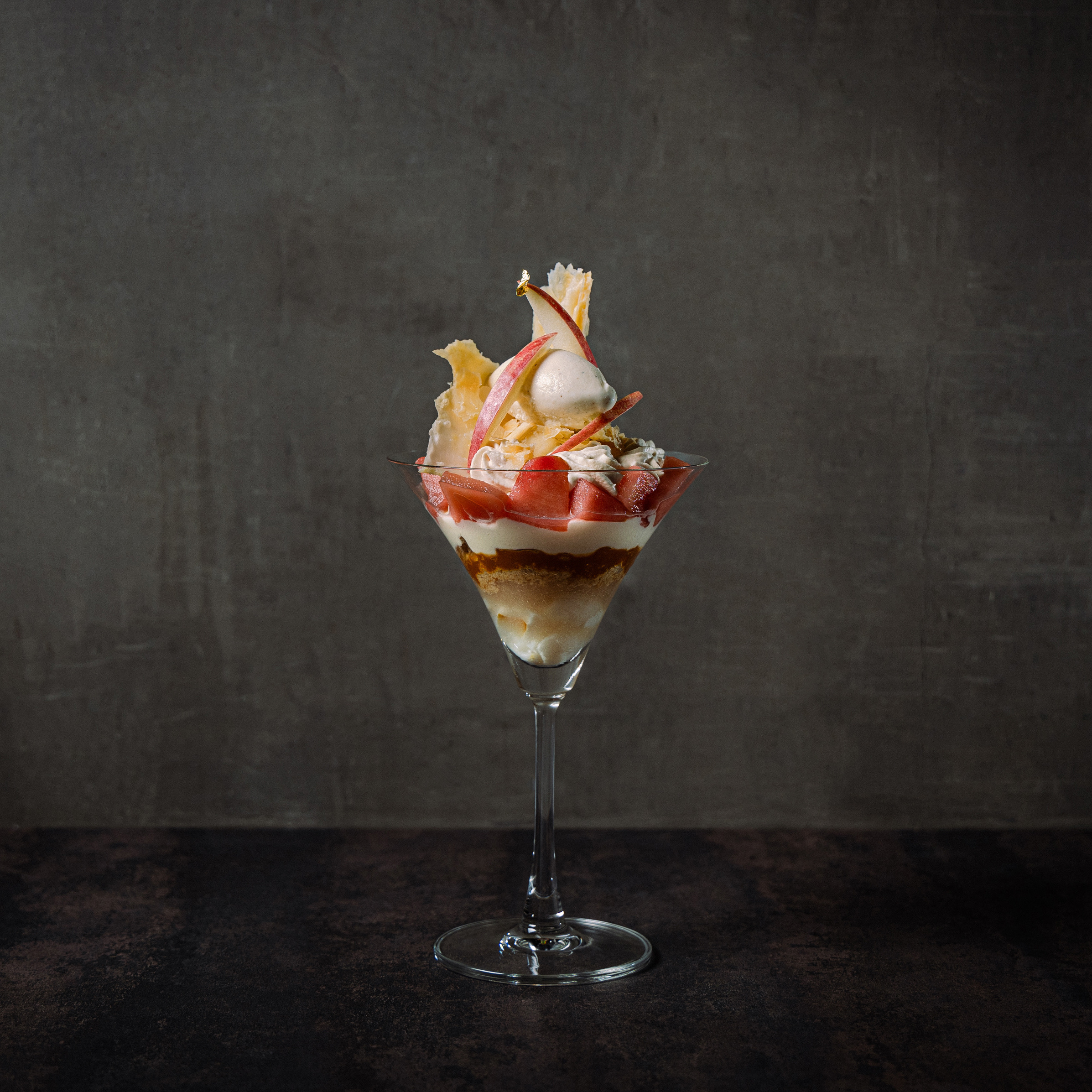 9月に旬を迎えるロマンりんごの香りが良く、フルーティで甘酸っぱさをライチとハイビスカスと合わせたフレッシュなアップルパイ仕立てのパフェ。りんごのジューシーさを最大限に活かした爽やかな味わいにするためにりんごには最小限の火入れを、クラシカルなアップルパイとは異なる夏の香りの残るスイーツに仕上げました。